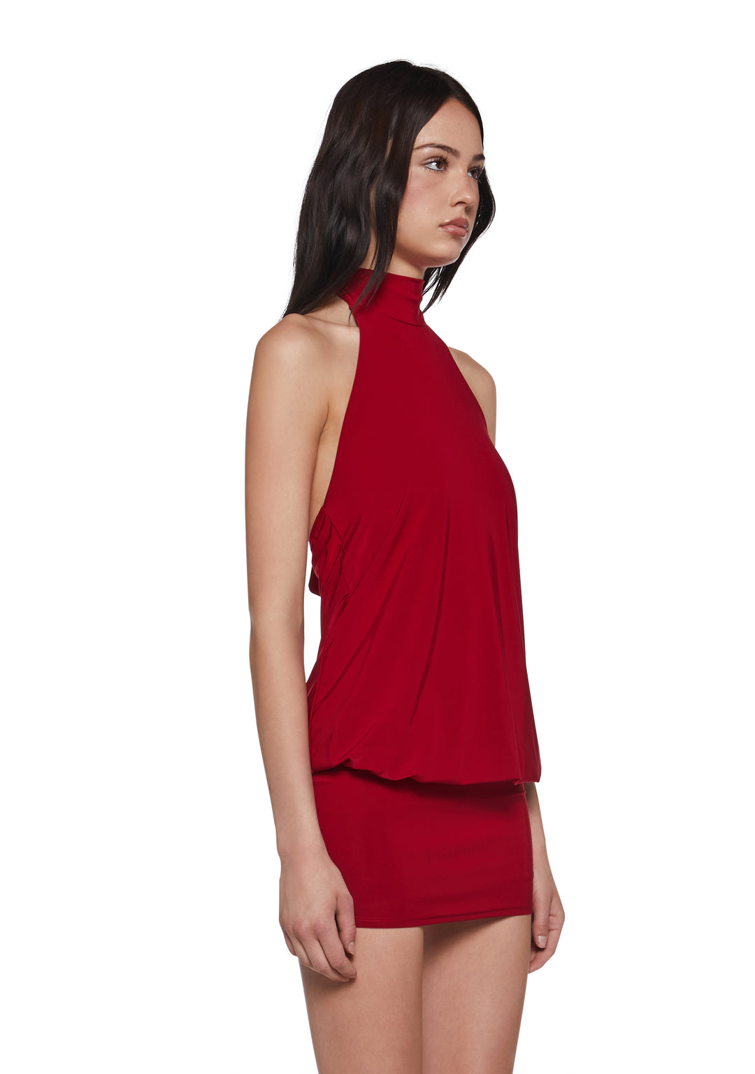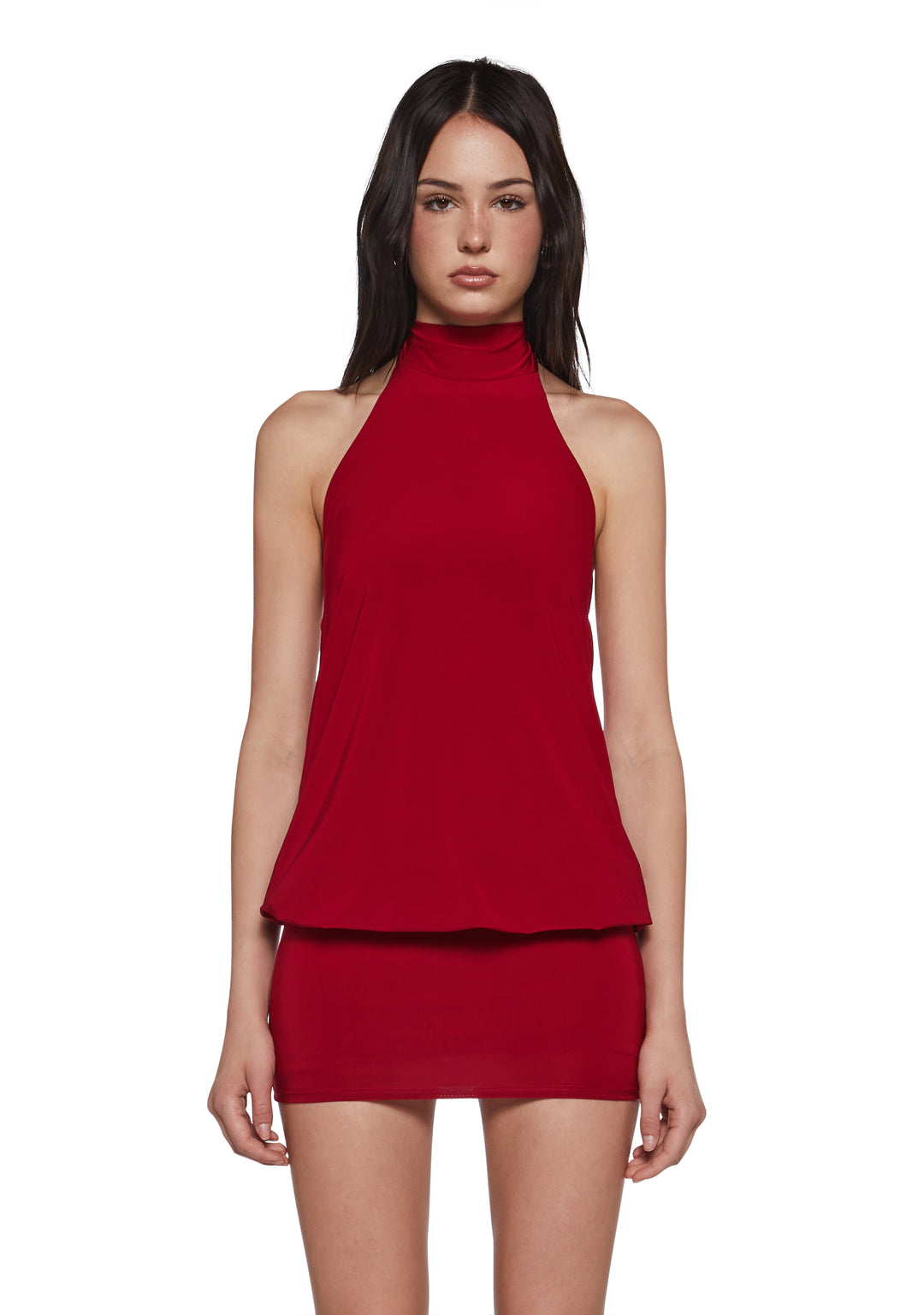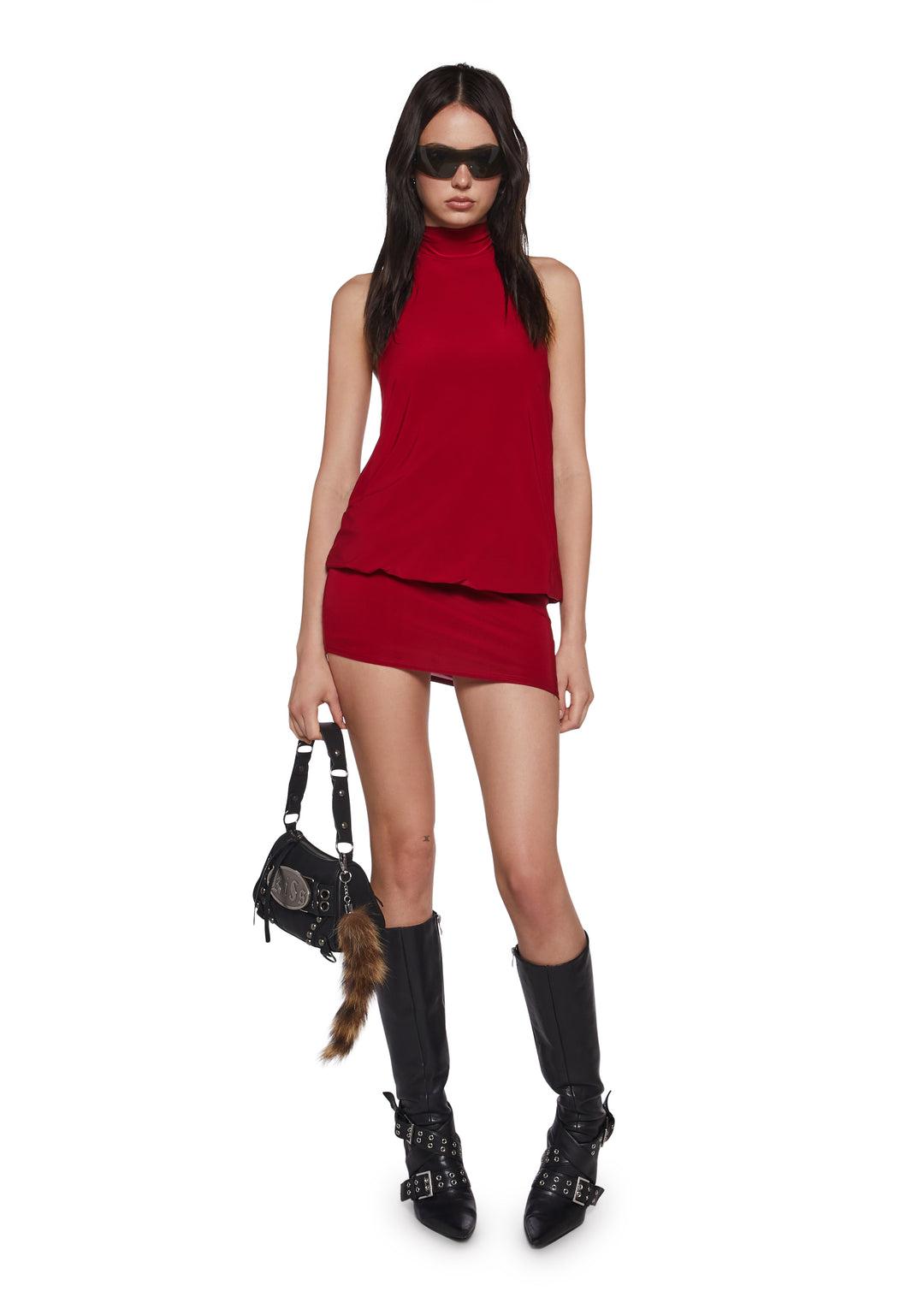 This mini dress has a mesh construction and a high halter neckline with adjustable back tie closures.