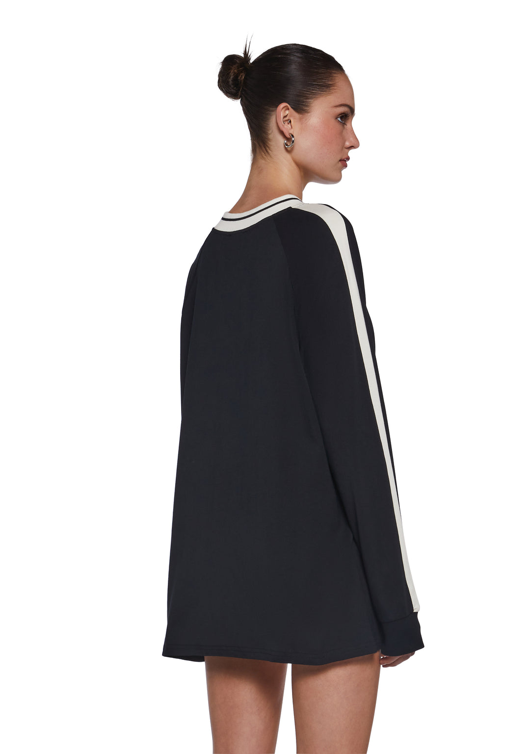 This top has a jersey knit construction,a colorblock design, long sleeves, and an oversized fit.