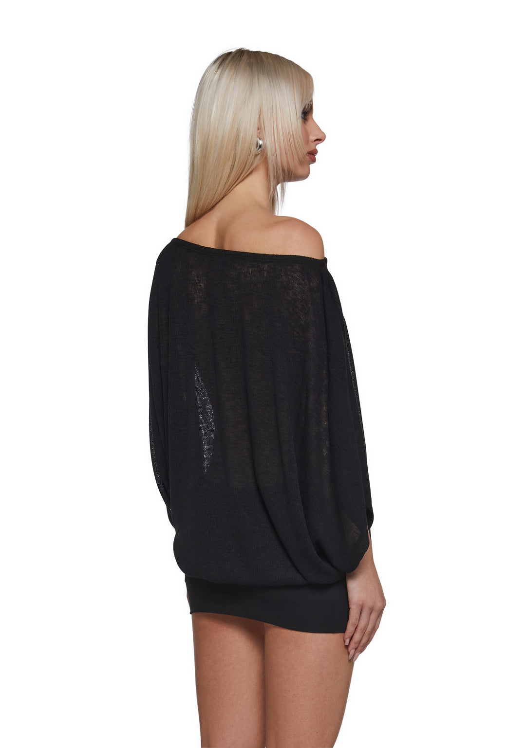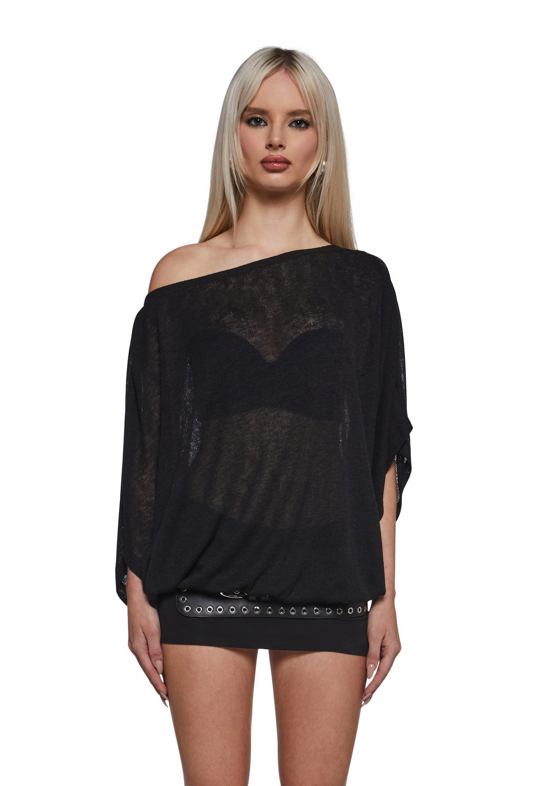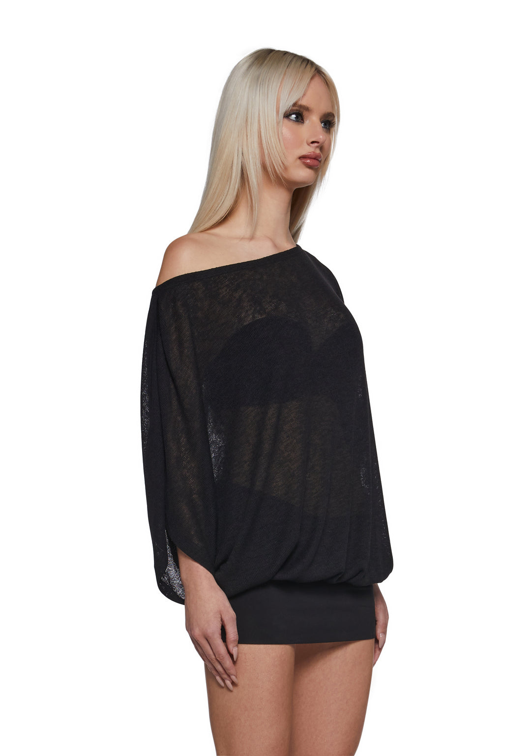 This mini dress has an off the shoulder design, a sheer knit construction, and a bubble hem.