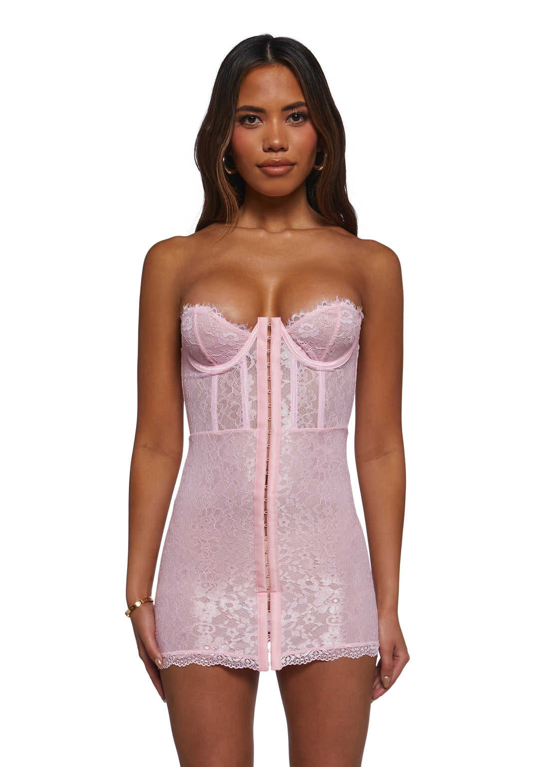 Hold all the attention when you wear this slip dress that has a stretchy lace construction, structured boning, an underwire bust, scalloped lace trim on the bust, a lace trimmed hem, and front hook and eye closures.