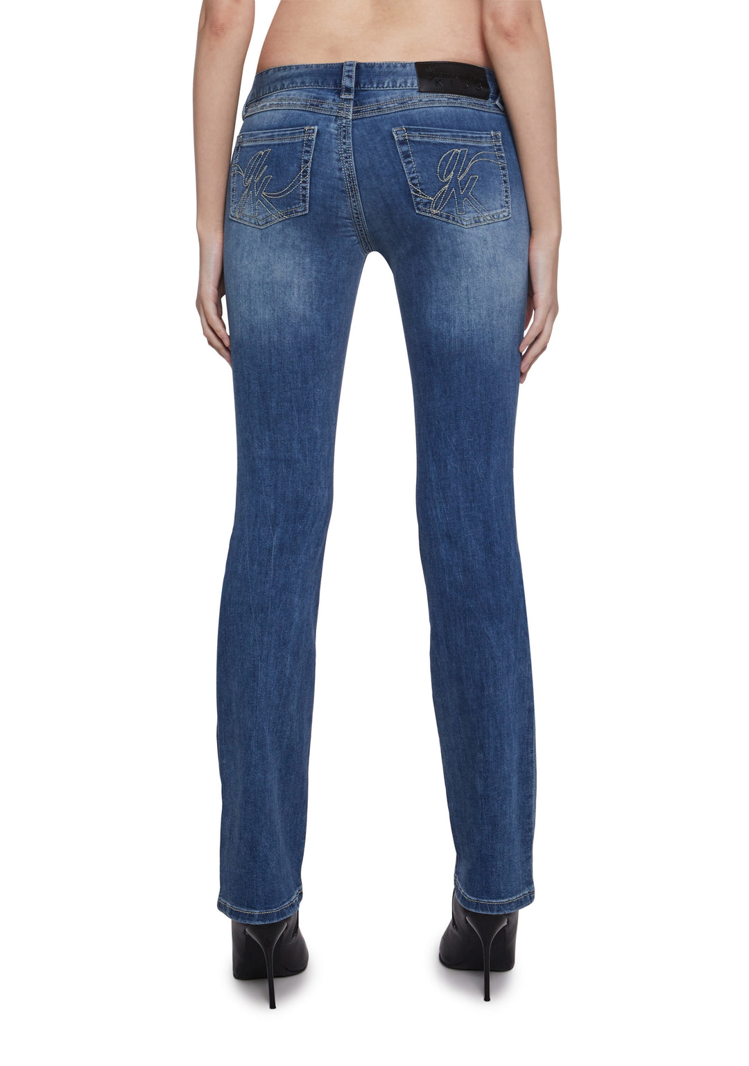 These jeans have a denim construction, a low rise fit, front and back pockets, and a front zipper closure.
