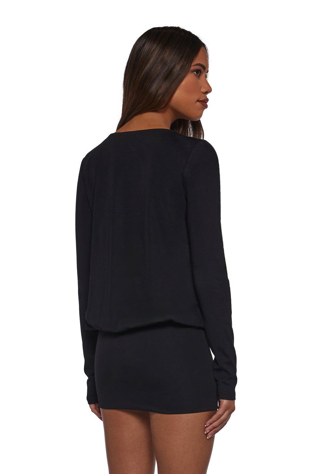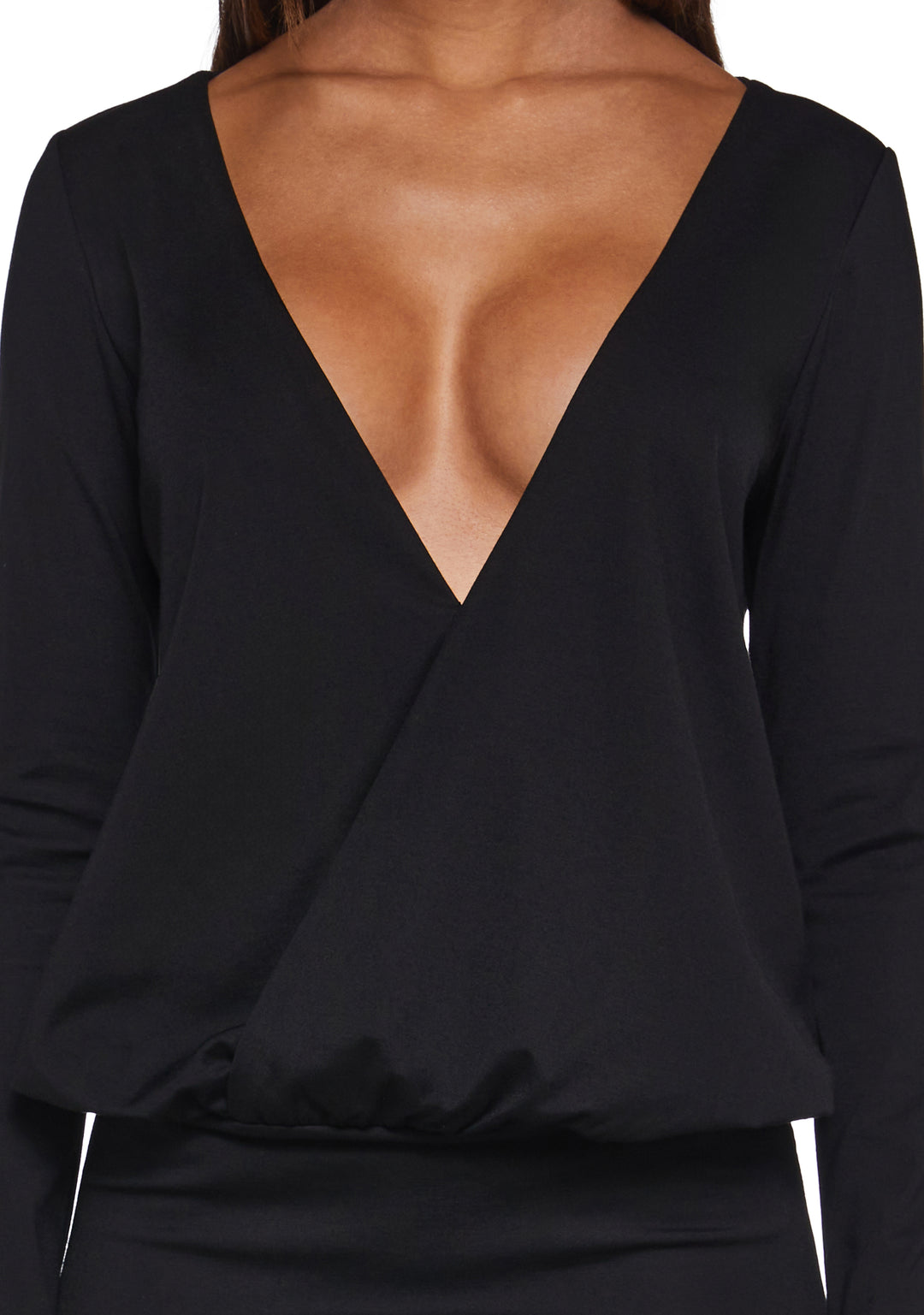 Make a statement in the Eira Bodycon Dress. This sleek dress features a jersey knit construction, long sleeves, a low waistline, and a deep V-neckline for bold, fashion-forward style.