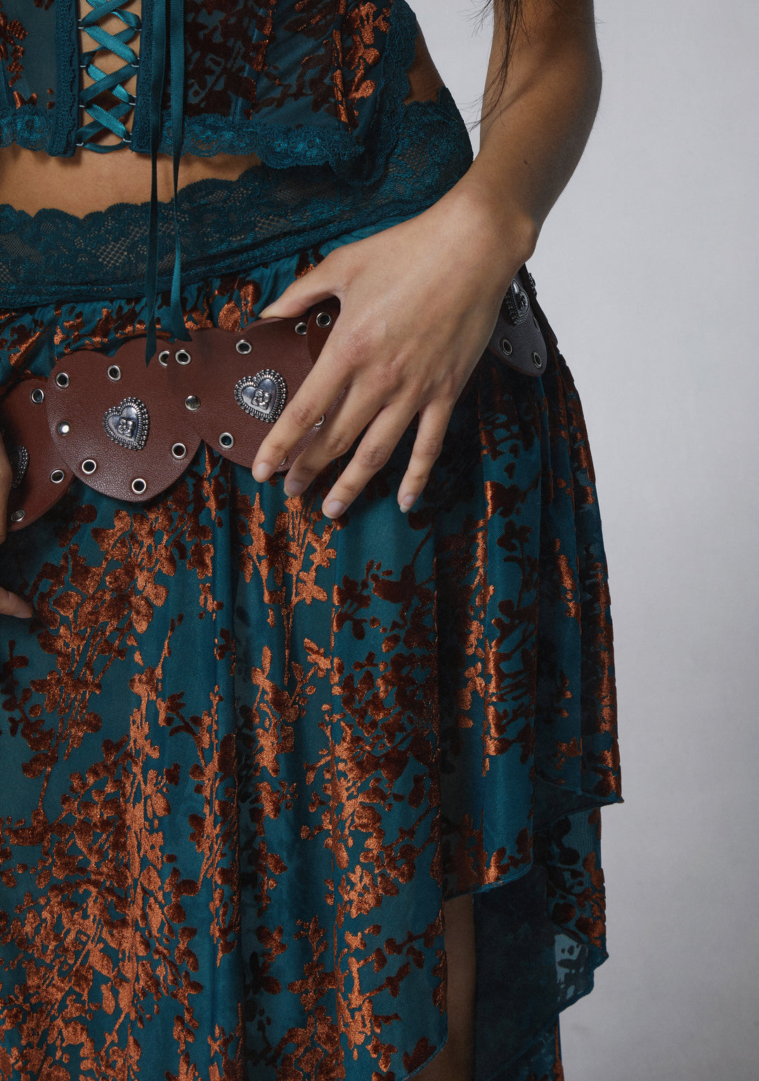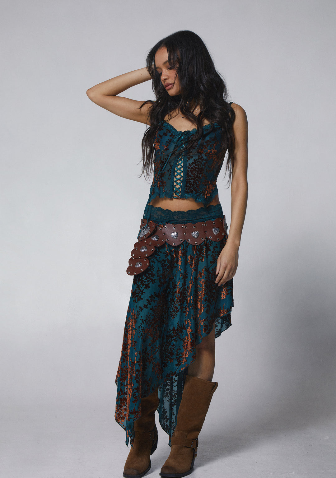 This skirt has a sheer mesh construction, an all over flocked floral design,a handkerchief asymmetrical hem, and a lace elastic waistband.