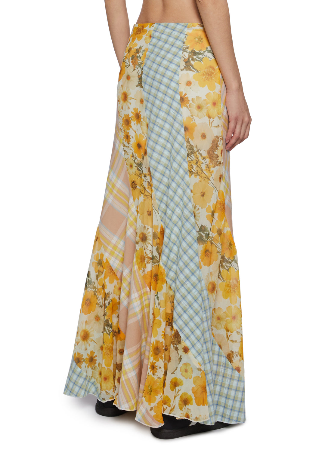 This maxi skirt has an all over patchwork floral and striped print, is fully lined, and has a side zipper closure.