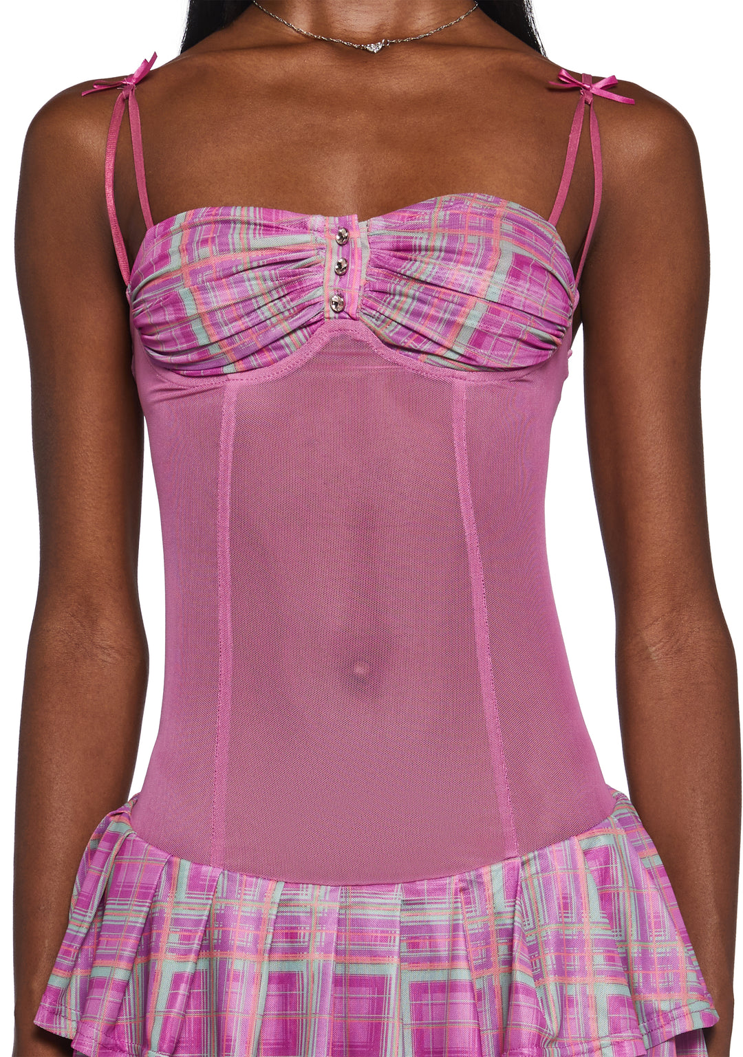 This mini dress has a plaid bustline, a sheer mesh bodice, a plaid ruffled mini skirt, rhinestone details, adjustable satin ribbon shoulder ties, and back zipper closures.