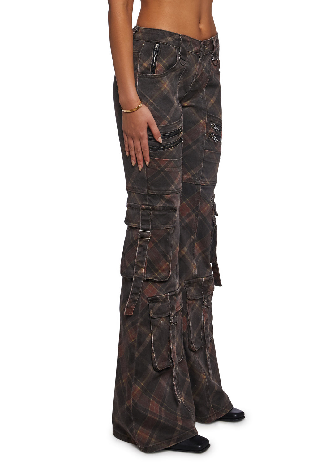 These low rise cargo pants have a stretchy twill construction, a plaid print, a skinny fit throughout the hips and thighs, a flared leg silhouette, D-ring hardware, zipper hardware trim, and cargo pockets on the front and back.
