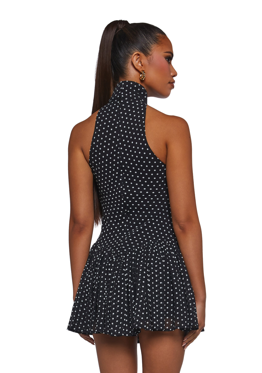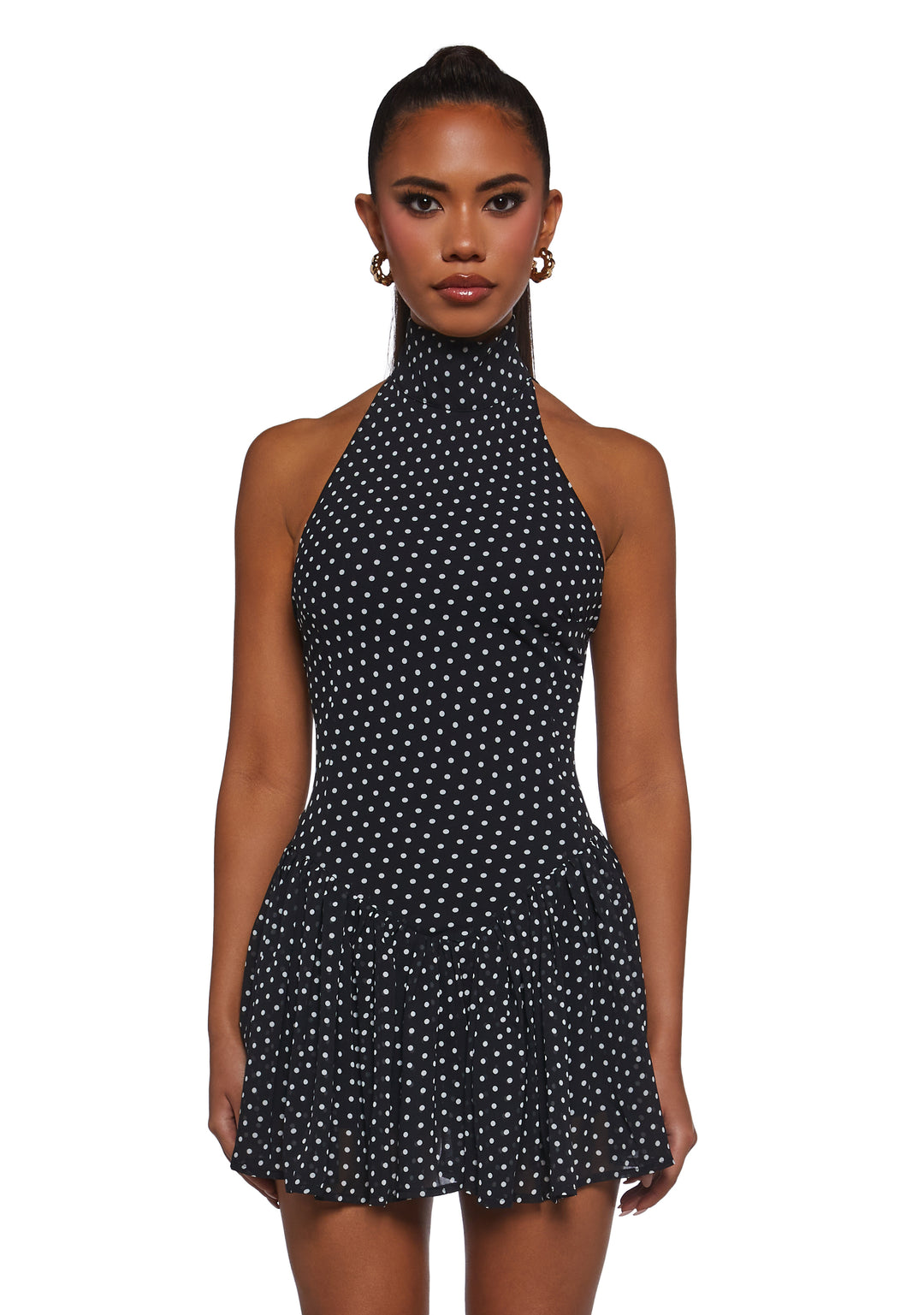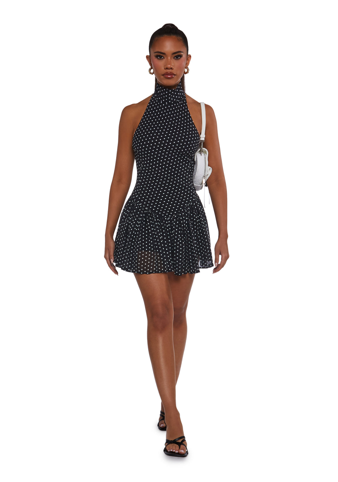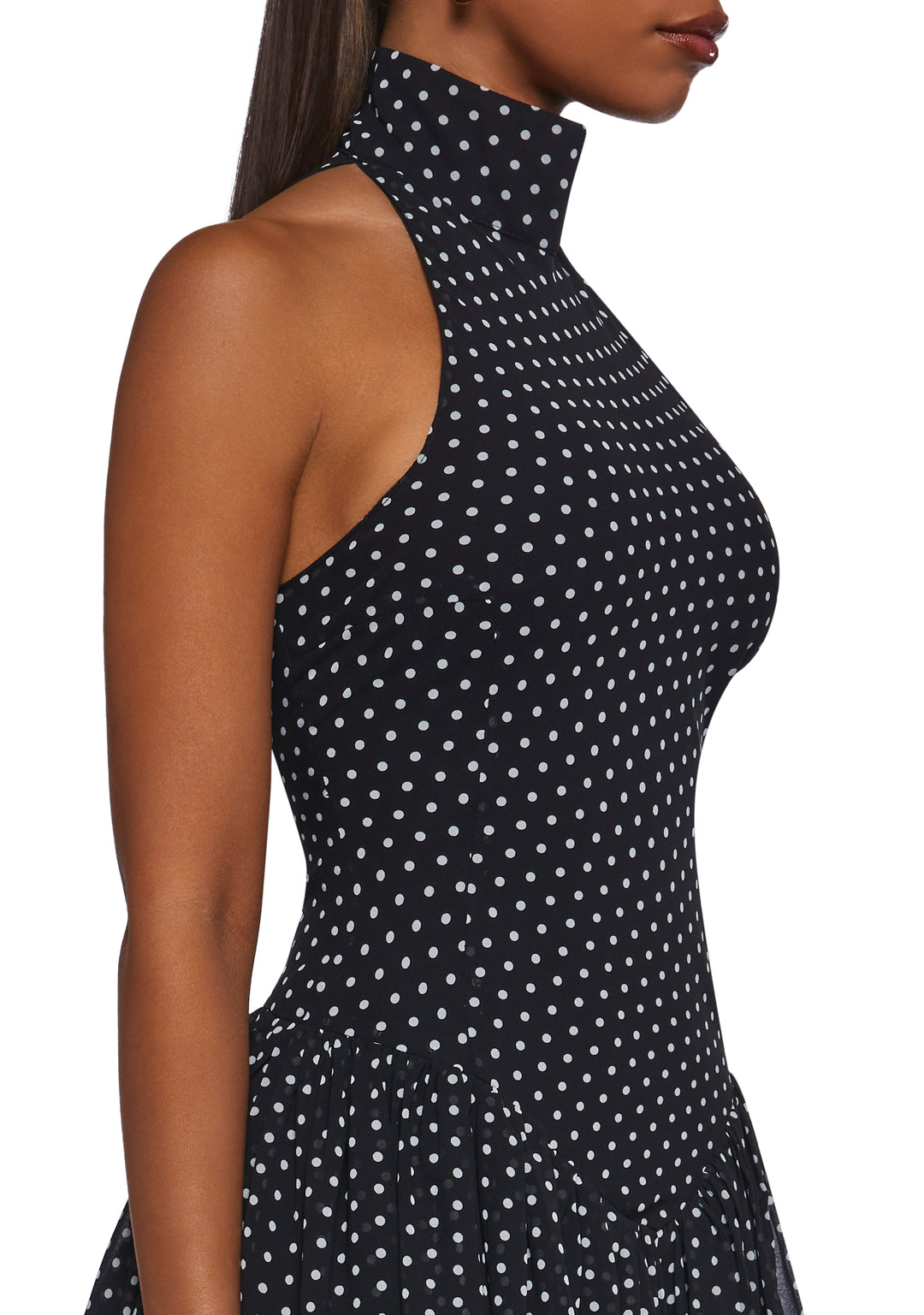 This mini dress has an all over polka dot pattern, a high halter neckline, a ruffled skirt, and a back zipper closure.