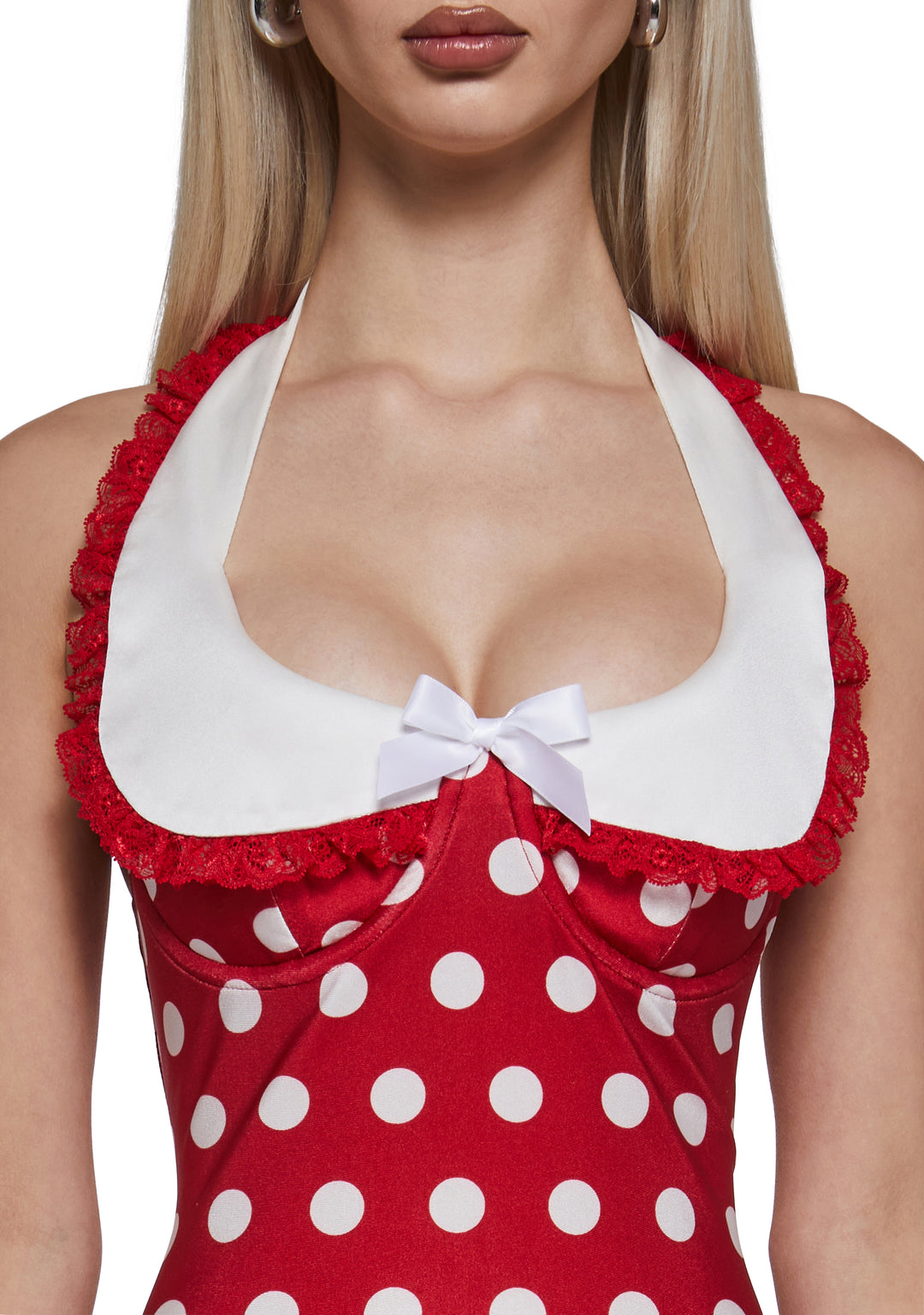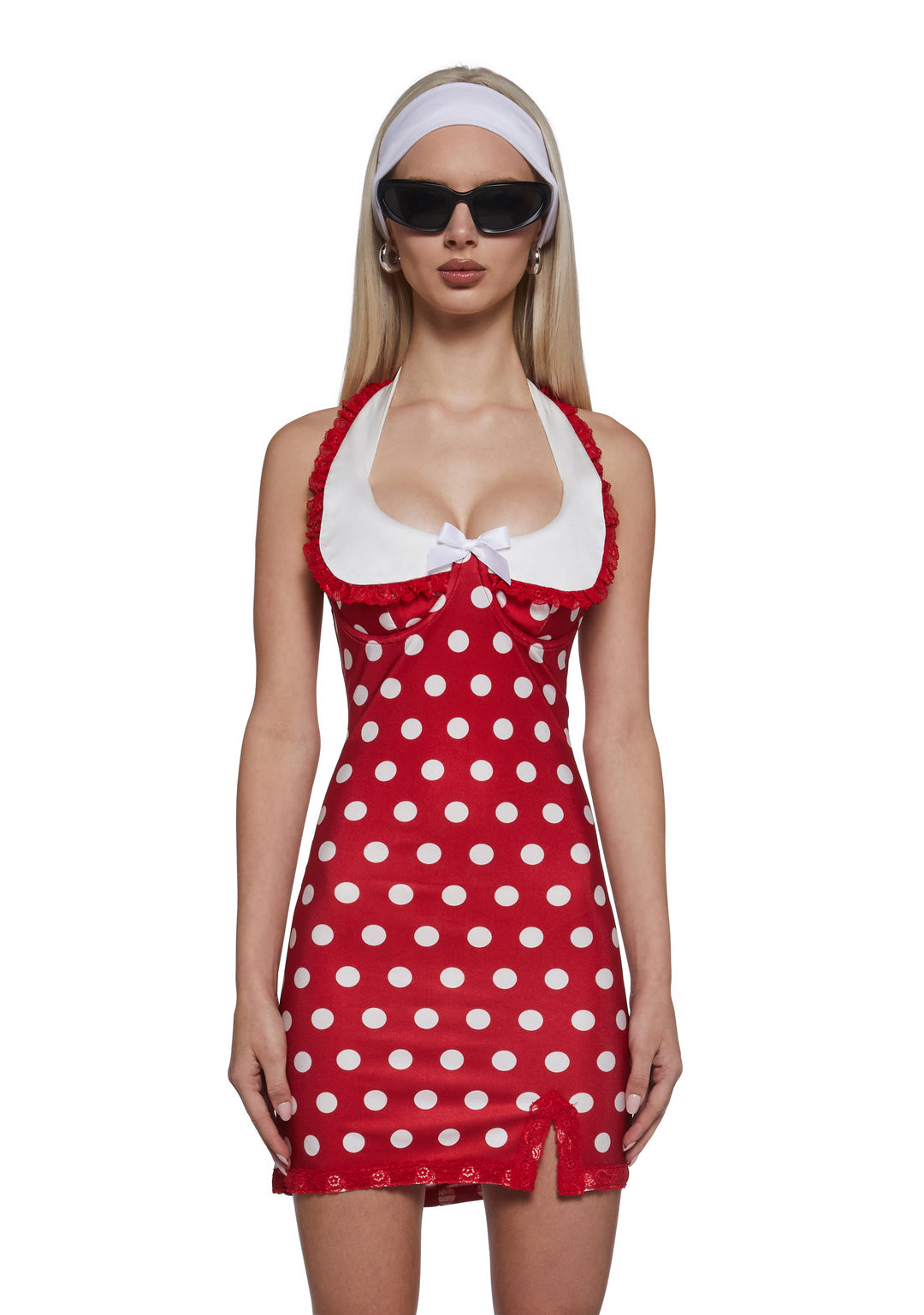 Look cute in this mini halter dress that has an all over polka dot pattern, a halter neckline with a lace trim and back button closures, an underwire bust, a front slit with a laced hem, and a back zipper closure.