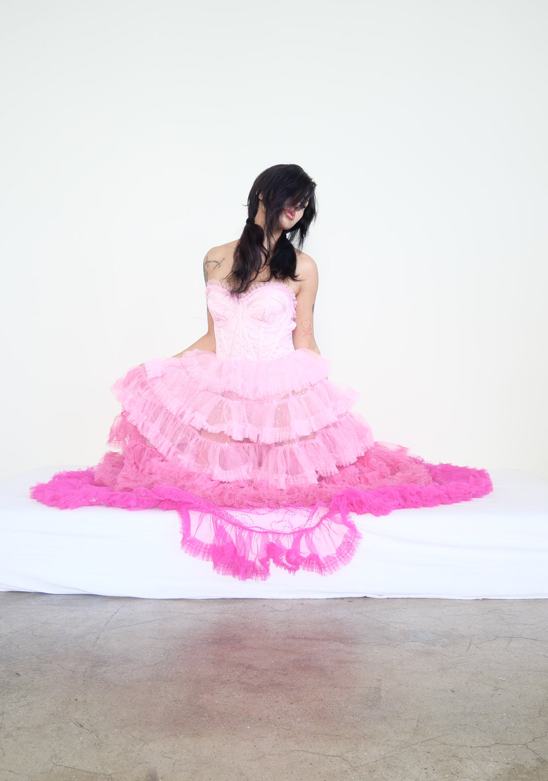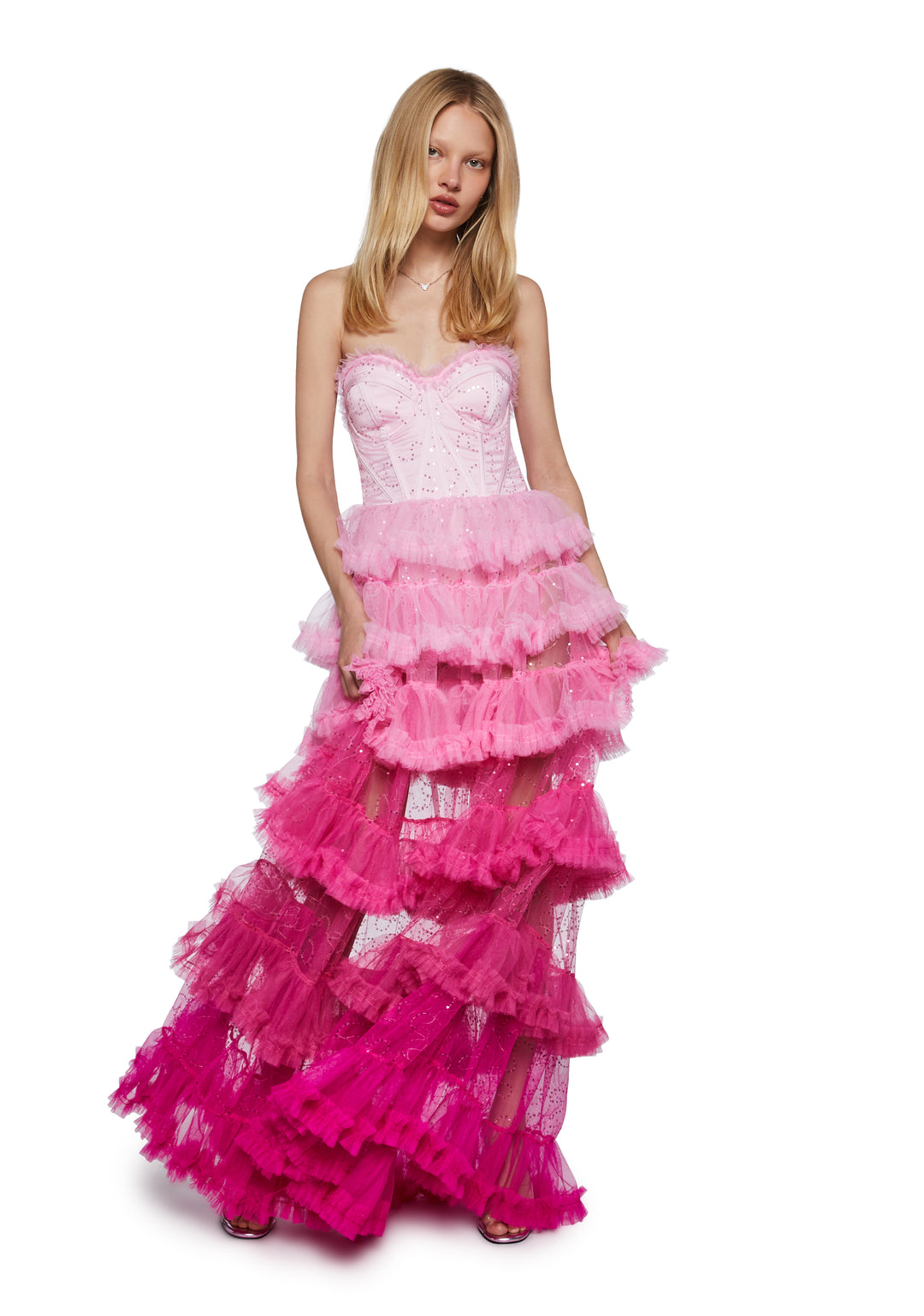 cuz til death babe. This ombre dress has a corset top with structured boning, a padded underwire bust, a sweetheart neckline, a ruffled trim along the bust, sequin detailing, a bodysuit underneath, a tiered ruffled skirt, a back contrast colored lace up design, and a side zipper closure.