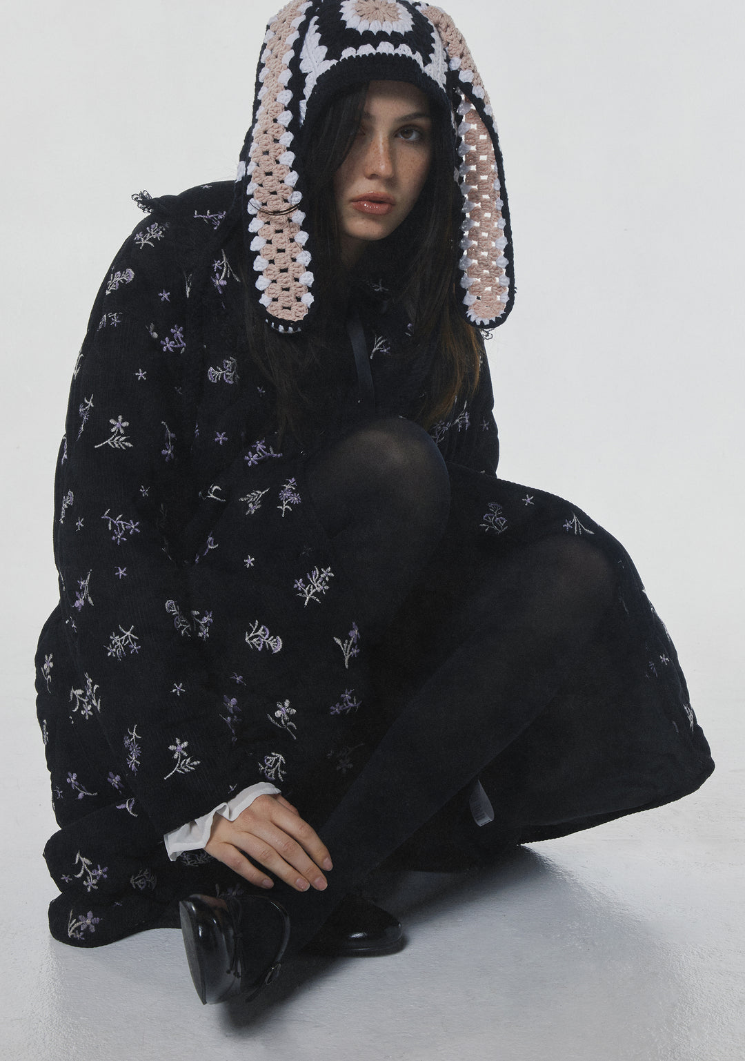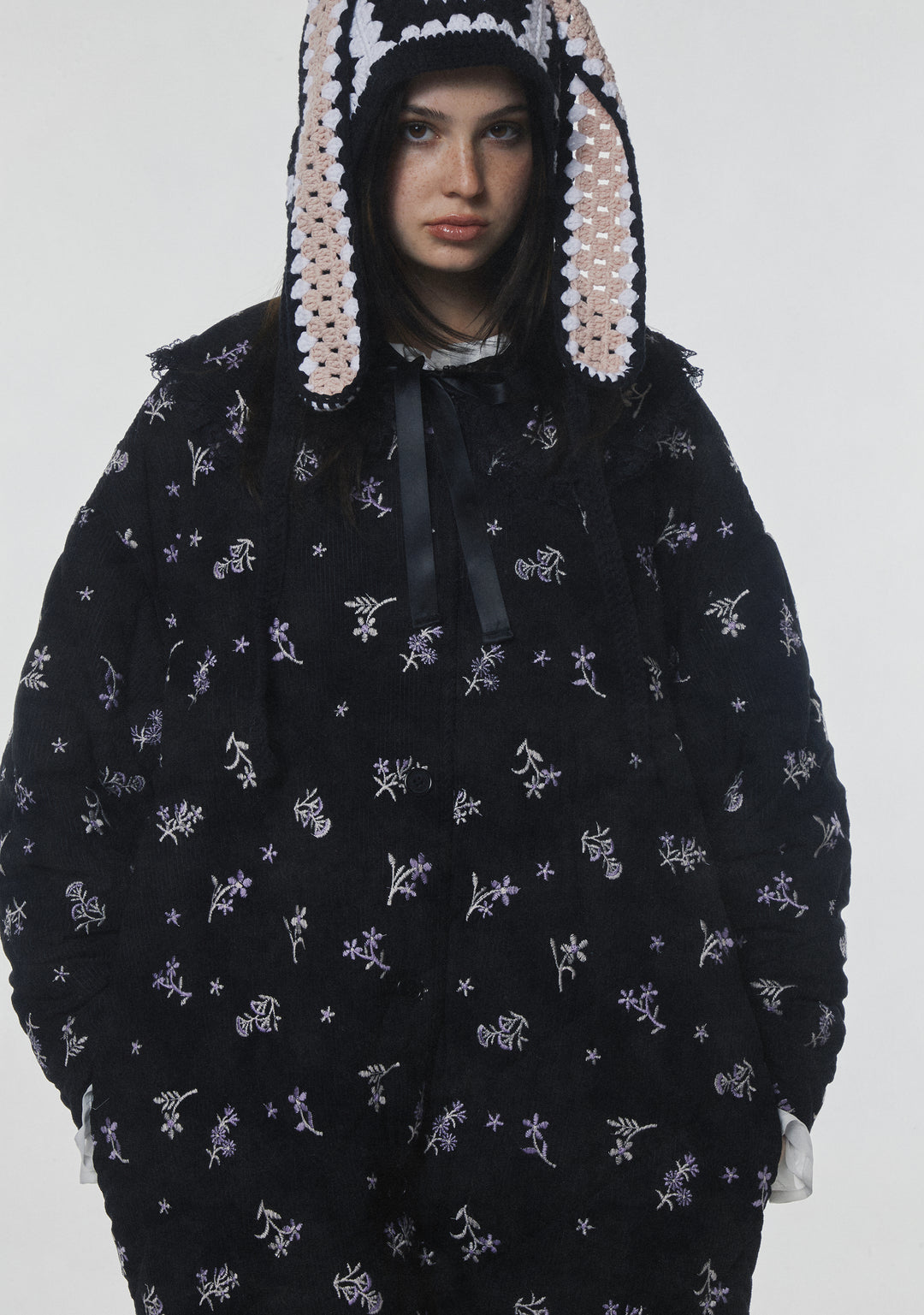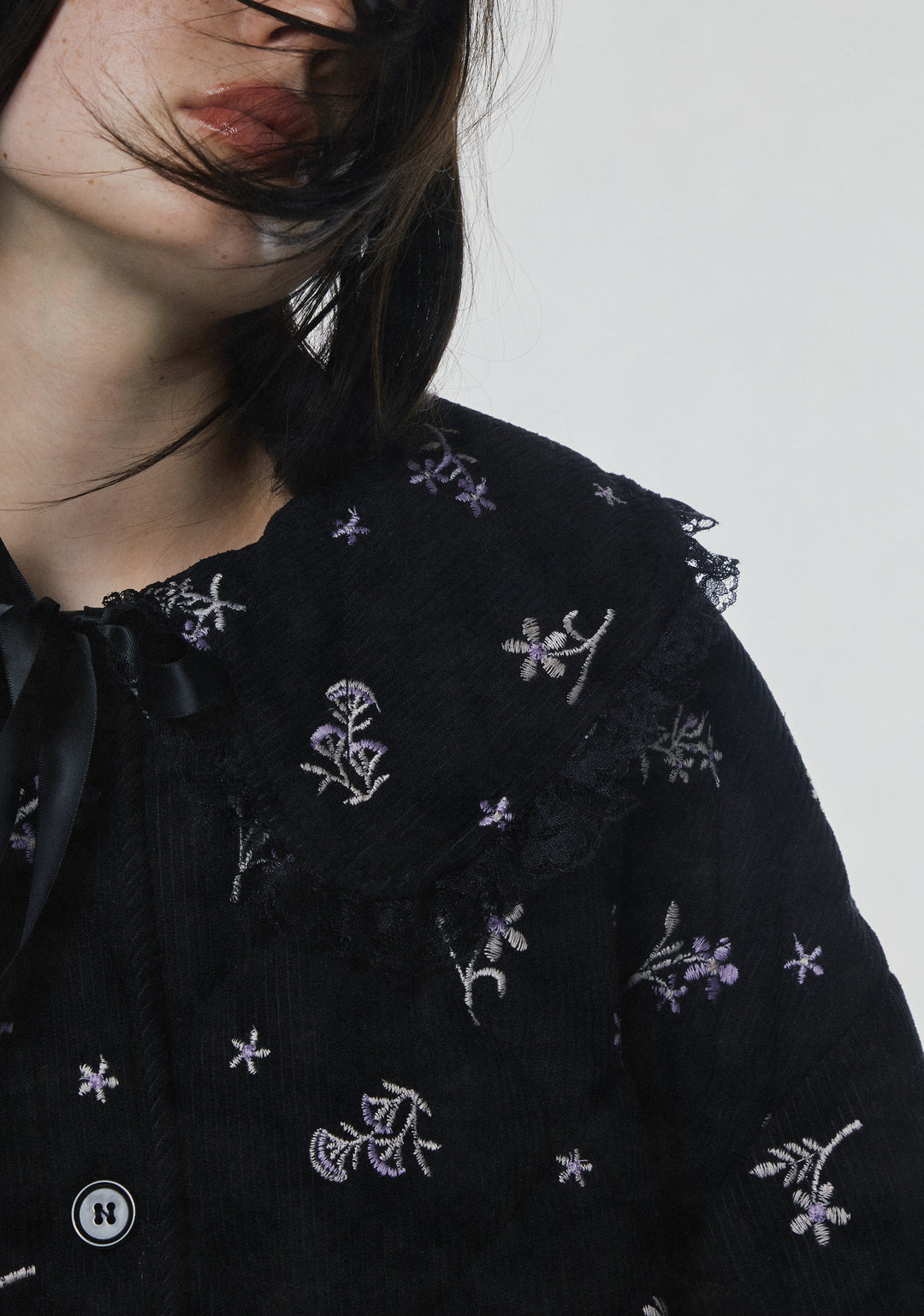 This coat has a satin lining, a quilted corduroy construction, embroidered floral details all over, side pockets, a collared neckline with a lace trim, a satin bow tie, and front button closures.