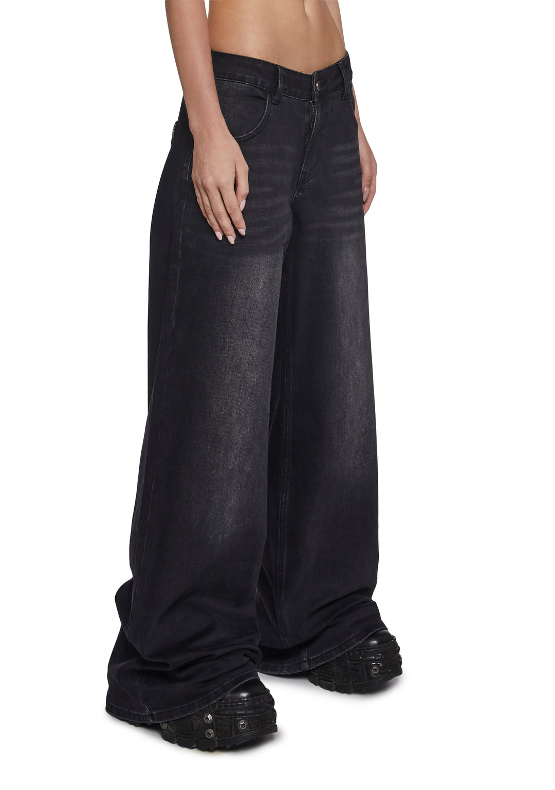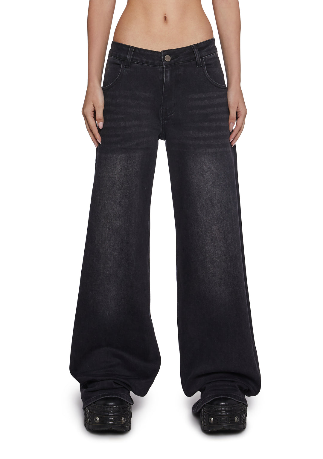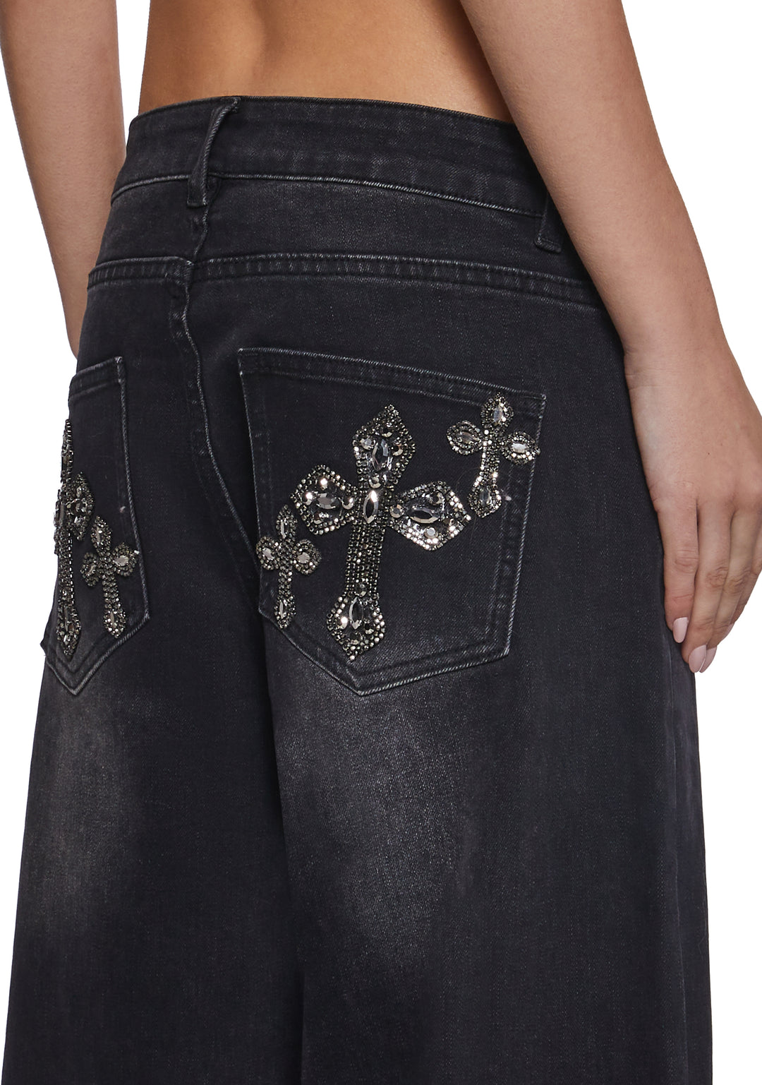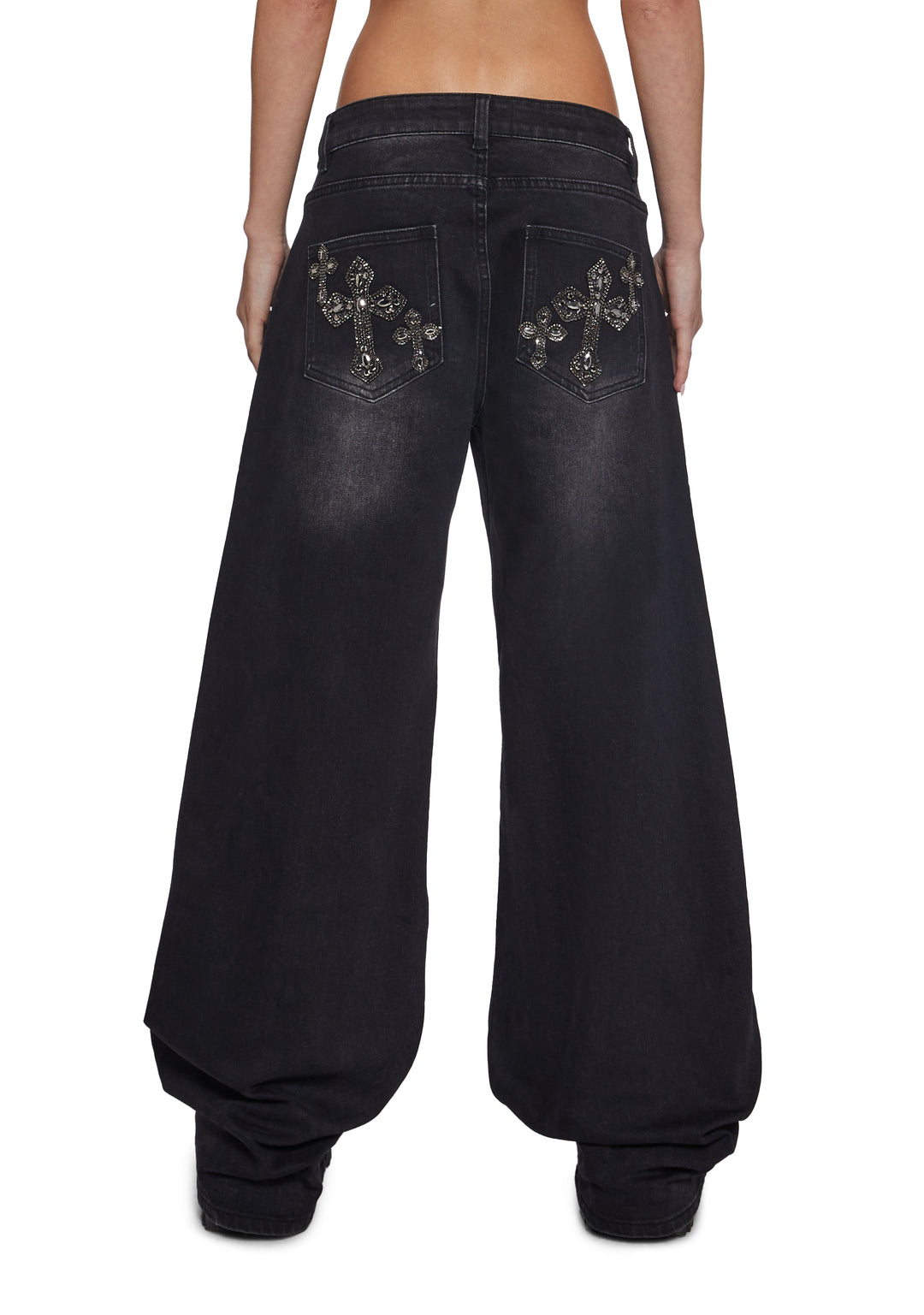 These jeans have a washed denim construction, a baggy leg silhouette, front pockets, gem and rhinestone encrusted crosses on the back pockets, and front button and zipper closure.