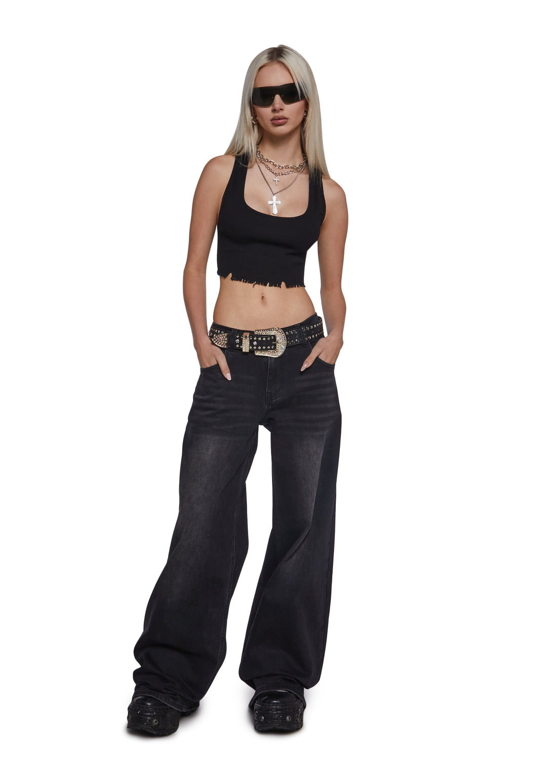A cropped baby tee, chunky platform sneakers, and a rhinestone-studded belt for a sparkling Y2K streetwear look.