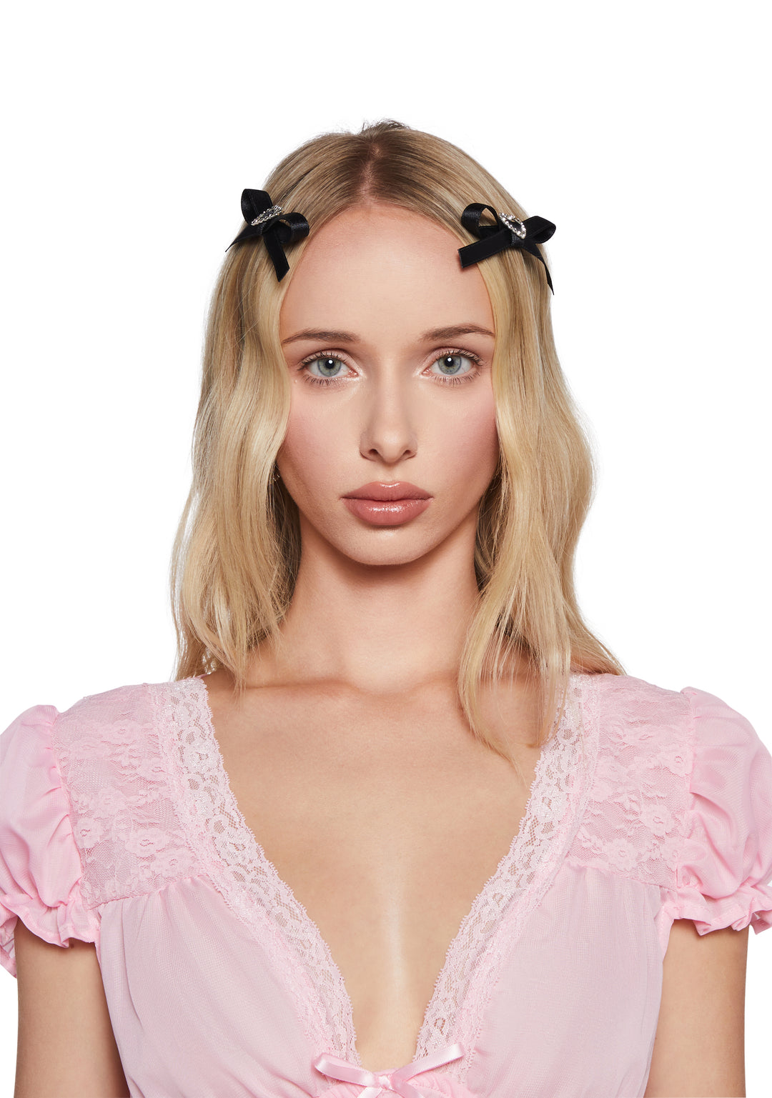 Look demure with this set of hair clips that feature a ribbon bow design, a rhinestone heart charm, and snap closures.