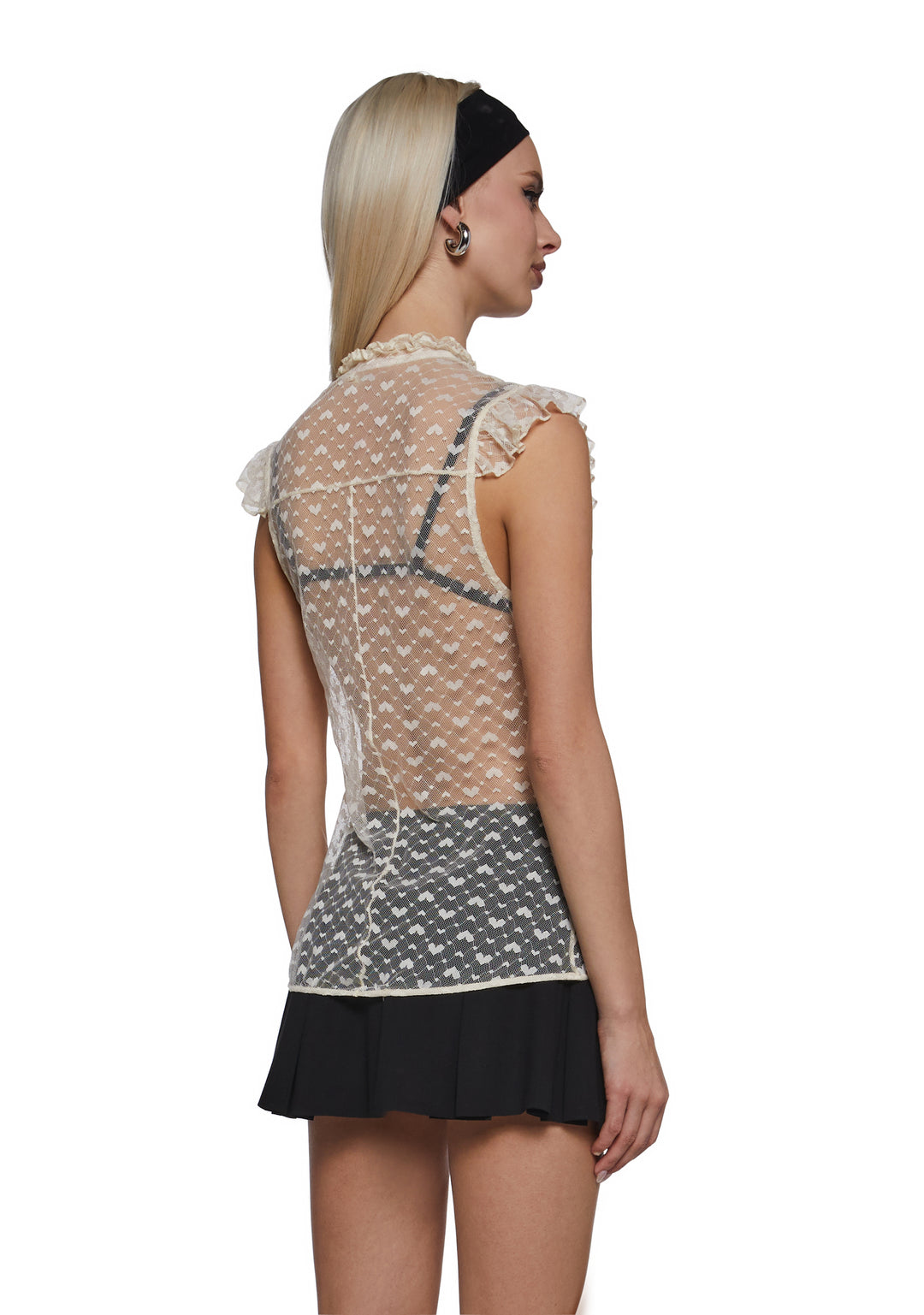 This romantic sheer lace top features an allover heart pattern with delicate ruffle detailing for a soft, feminine look. Designed with a high neckline and button-front closure, it creates a flattering fitted silhouette that??s perfect for layering or wearing as a statement piece.