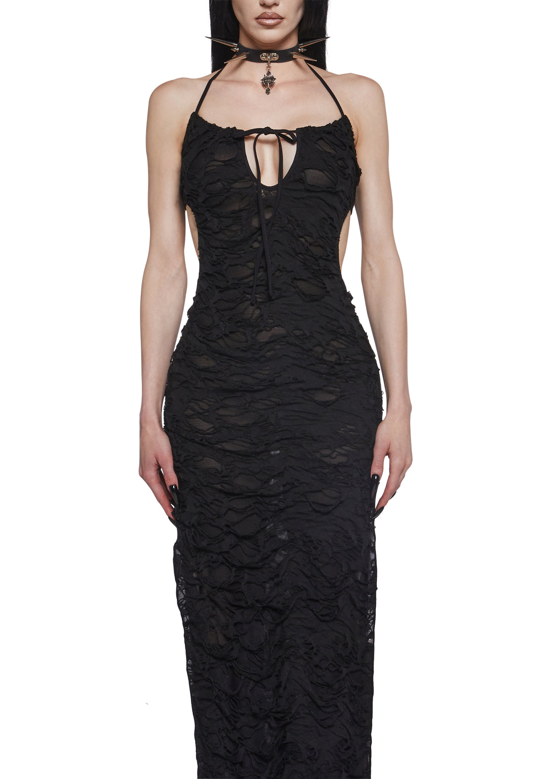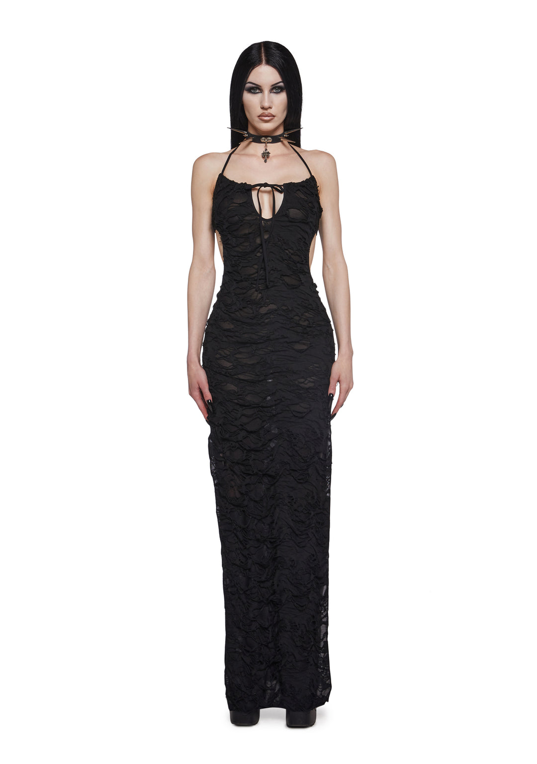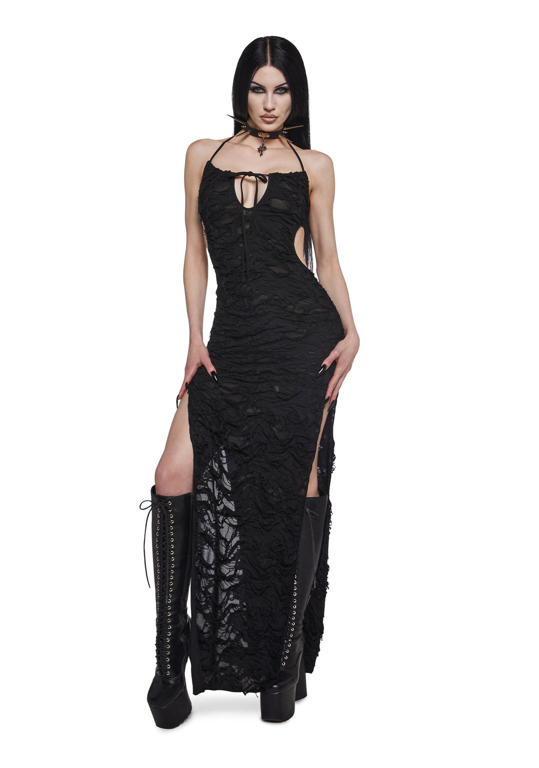 Look enchanting with this maxi dress that has a shredded hole design, a front lace-up bow, a halter neckline with adjustable back tie closures, cut out details, and high double side slits.