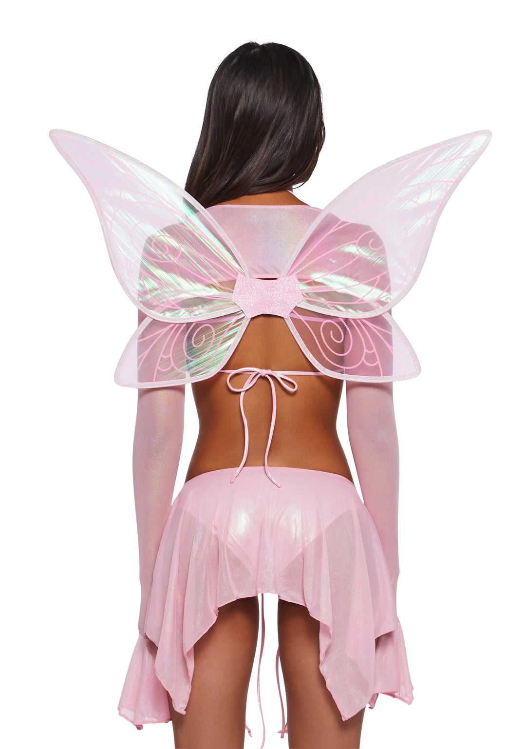 This set includes a bra top that has a shimmer metallic construction, back tie closures, an iridescent long sleeve shrug, matching bottoms and skirt with front tie closures, and comes with iridescent fairy wings.