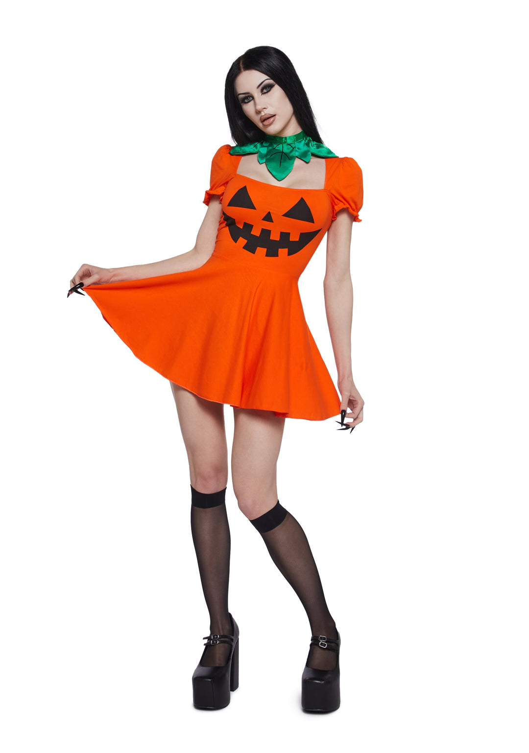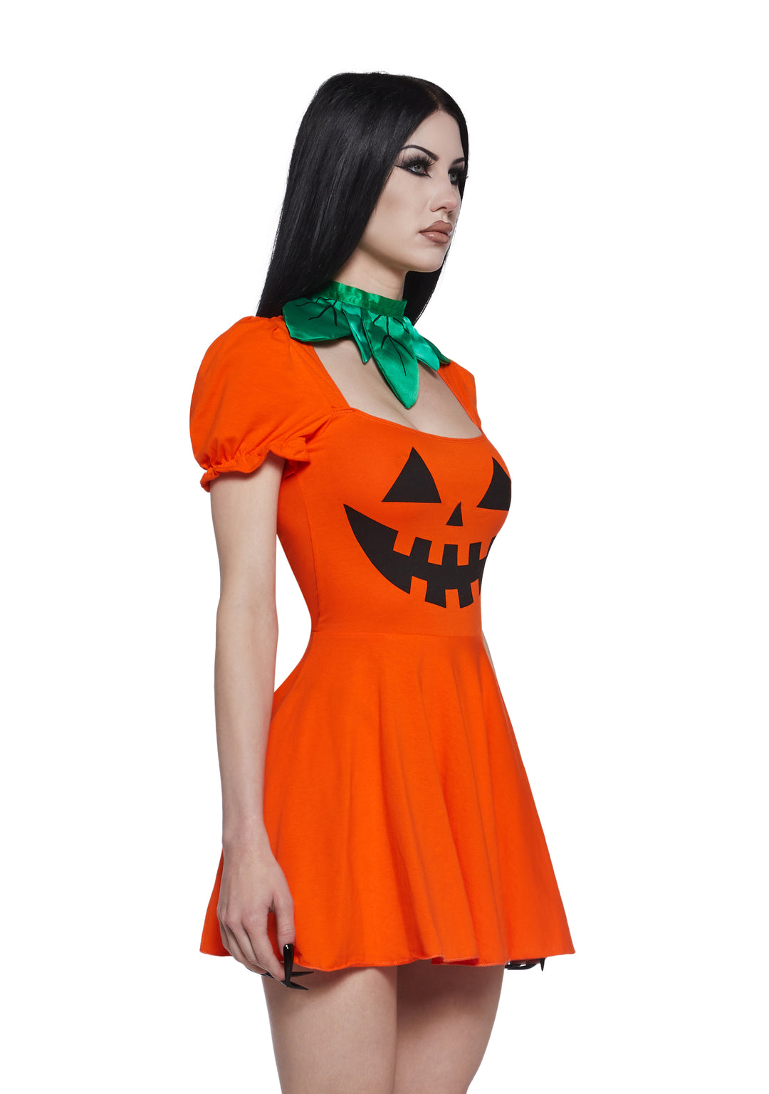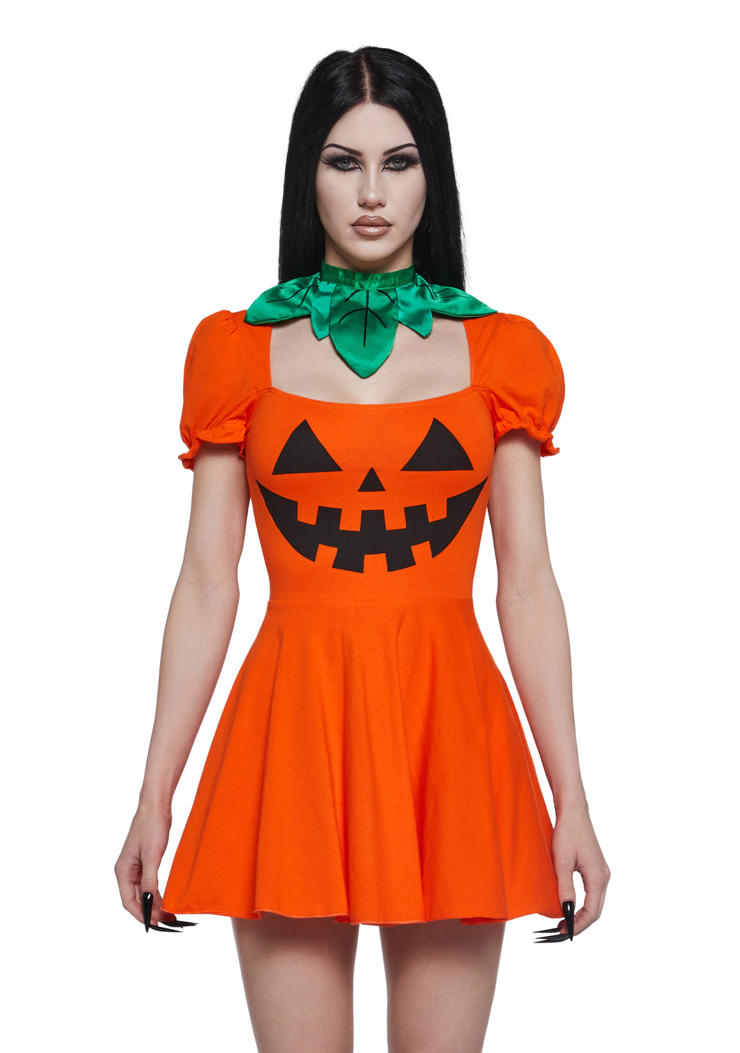 This pumpkin costume dress is a fun and festive choice for Halloween. It features a bright orange color with a classic jack-o??-lantern face printed on the front and puff sleeves for a playful touch. The dress includes a green leaf collar that mimics a pumpkin stem, completing the look. Comfortable and easy to wear, this pumpkin outfit is perfect for Halloween parties, trick-or-treating, or themed events, making it a cute and simple option for celebrating the spooky season.