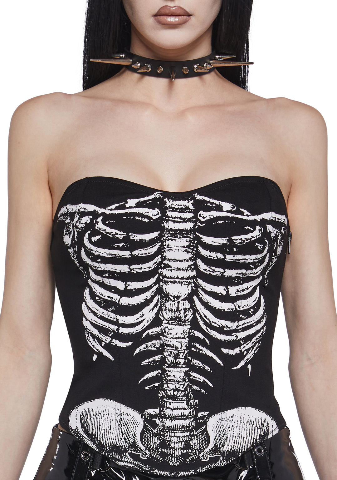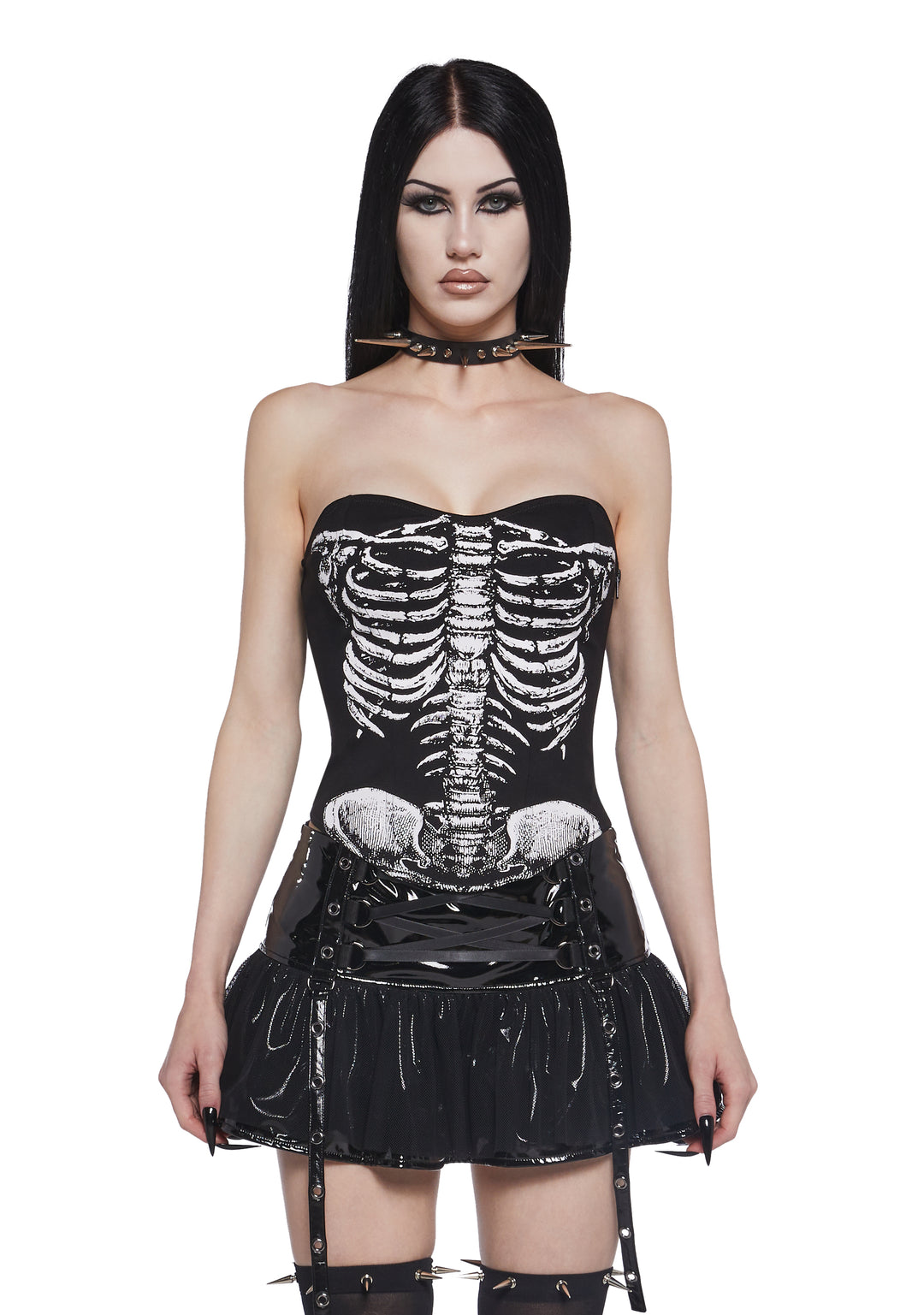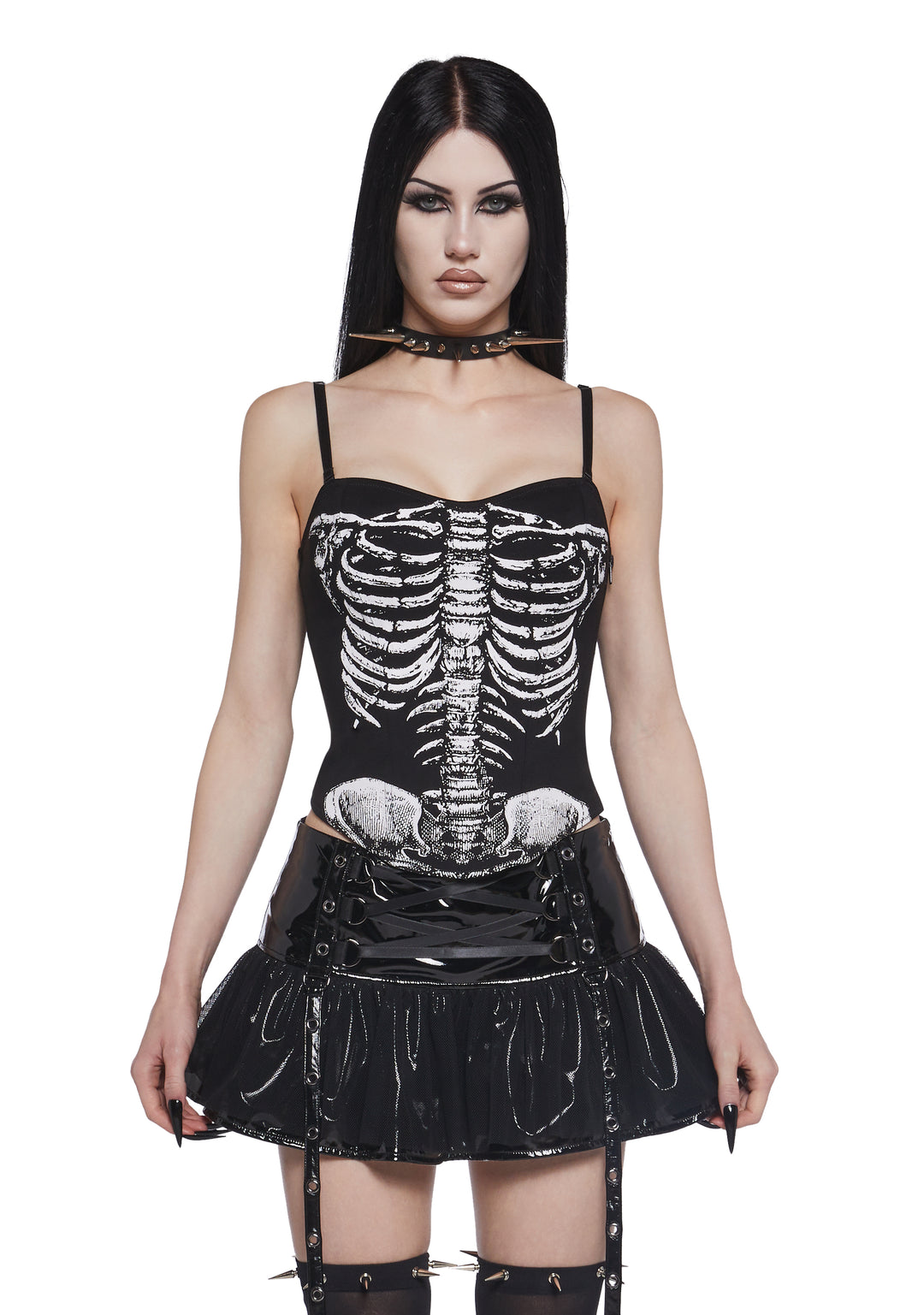 Stand out with spooky style in this bold skeleton corset top, perfect for Halloween, cosplay, or gothic fashion looks. Featuring a striking rib cage print on the front, this fitted corset has lace-up details at the back, removable adjustable straps, and a convenient side zipper for the perfect fit. The edgy design creates a flattering silhouette while adding a dark, eye-catching vibe to any outfit. Pair it with skirts, pants, or layered accessories to create the ultimate skeleton-inspired costume or gothic statement piece.