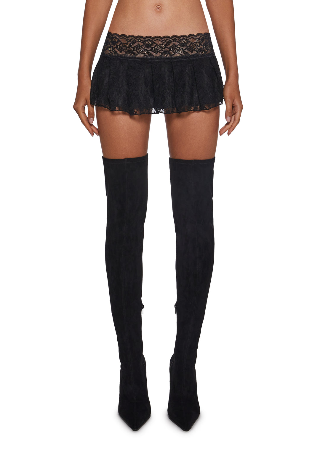 This skirt has a stretchy lace construction, is fully lined, and a pleated design.