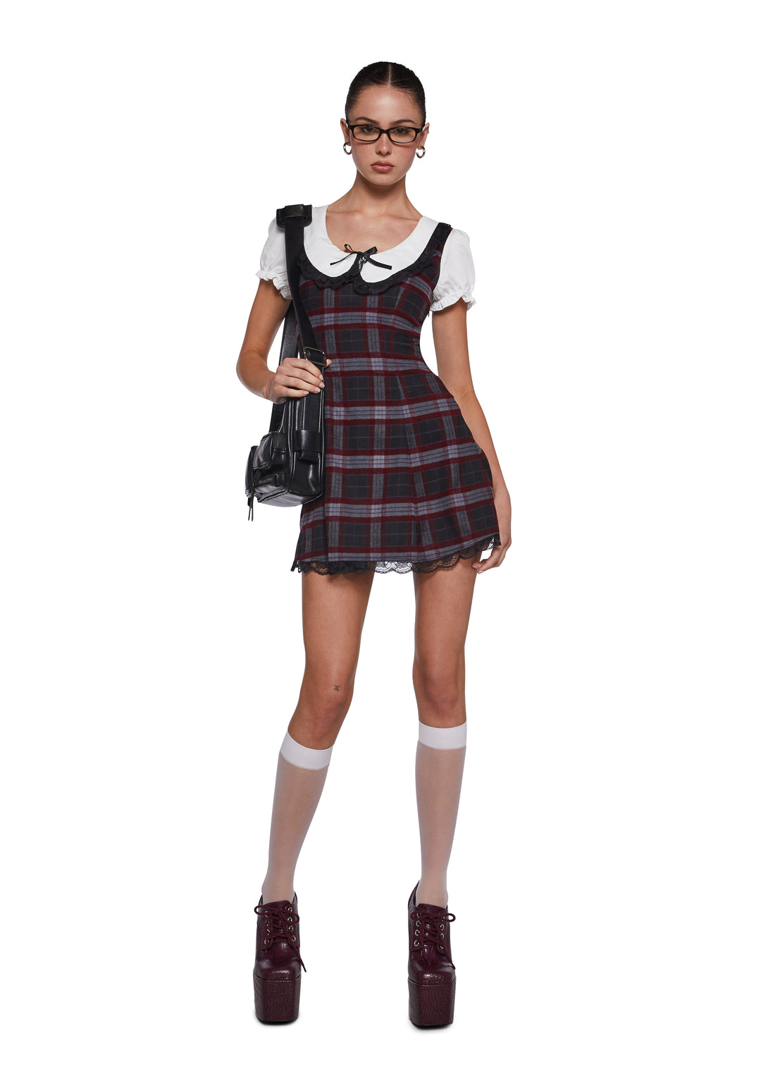This mini dress has a plaid print, a white peter pan collared neckline, puffy sleeves, a lace trim, a decorative bow on the front, and a lace hem.
