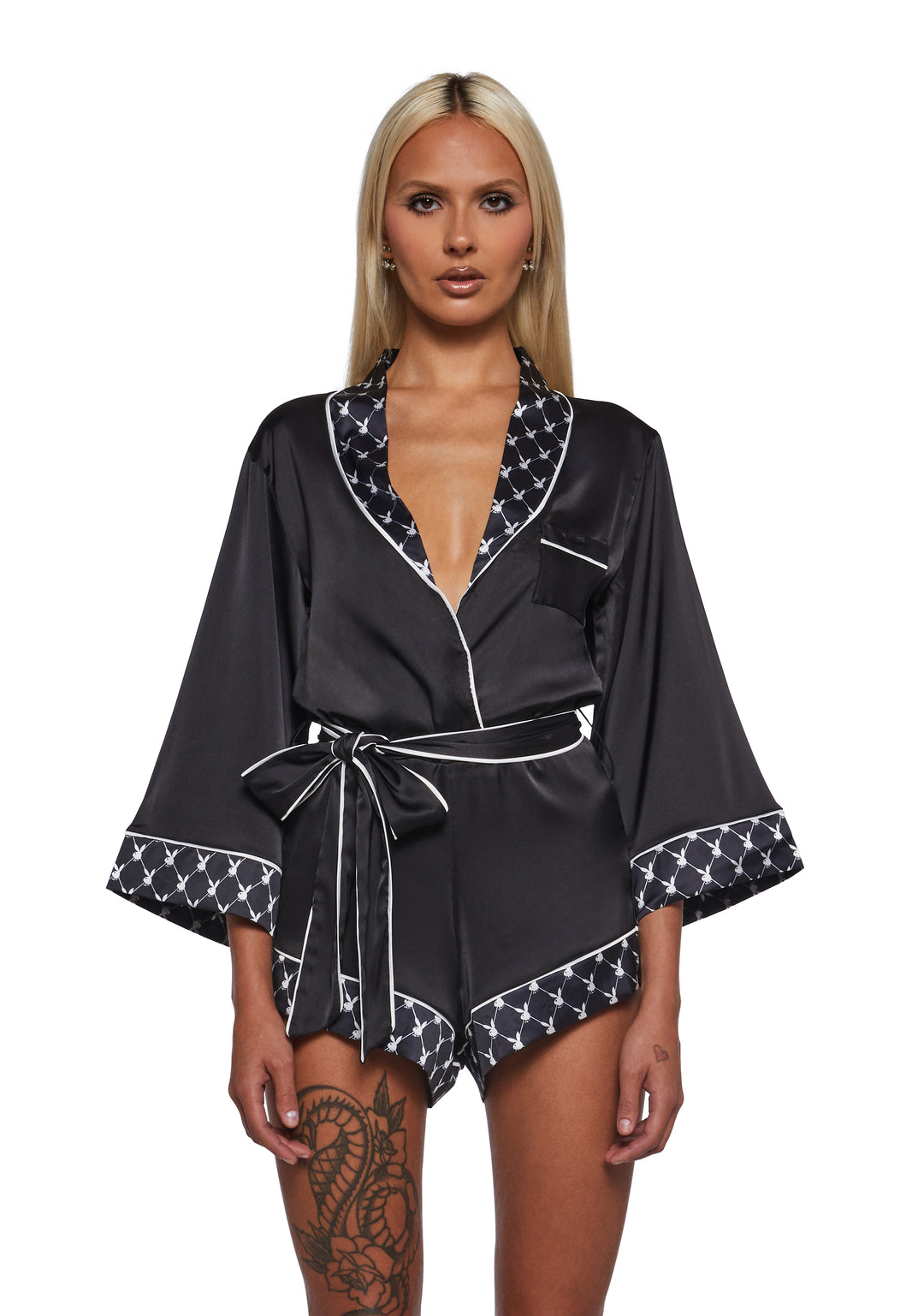 This romper has a sateen construction, contrast colored piping trim, a patch pocket, Playboy Bunny logo diamond screen print on the collar and cuffs, and an adjustable waist sash.