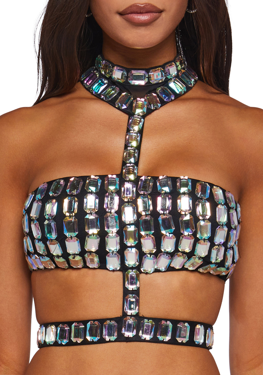 Womens Sexy Rhinestone Gem Harness Top – Silver