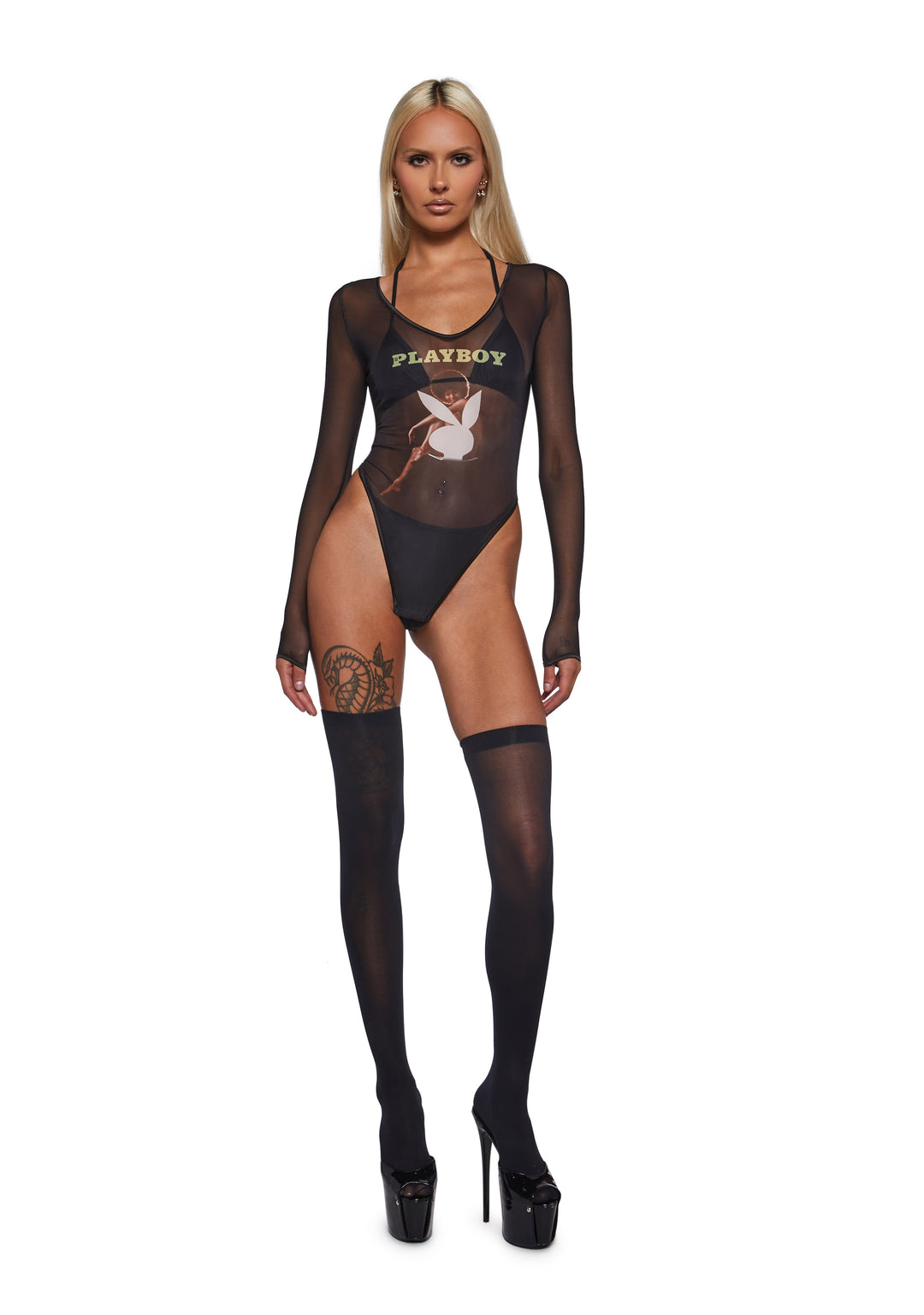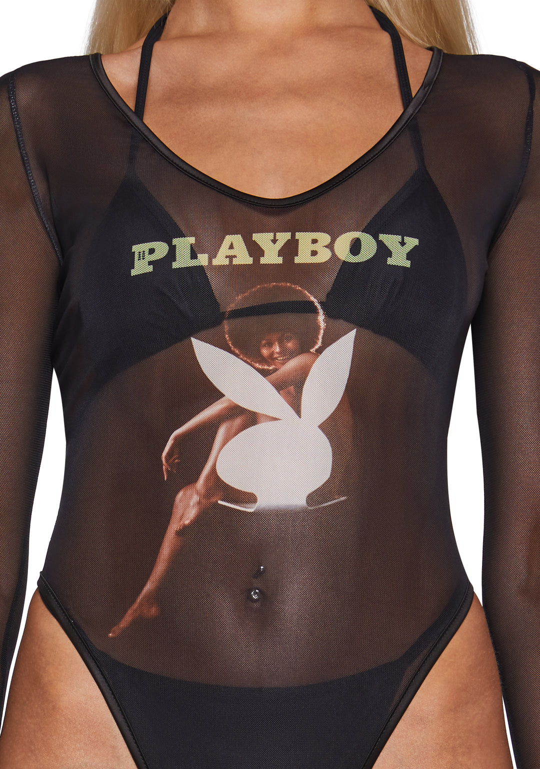 This teddy has a sheer mesh construction, a satin binding, long sleeves, Playboy cover graphic print on the front, and a snap crotch closure.