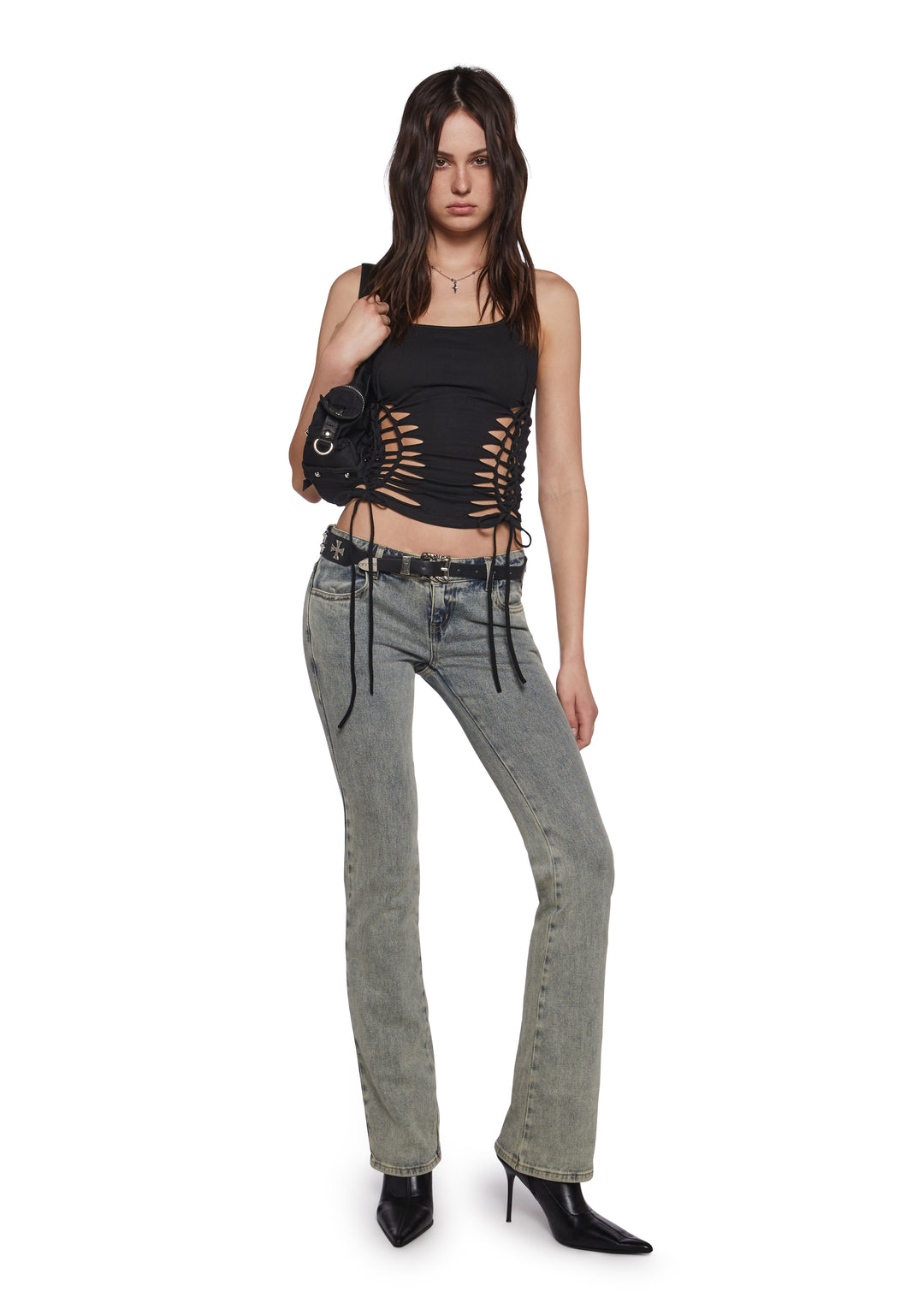 This tank has a slashed design on the sides and back, a cropped fit, and ruching with adjustable tie closures on the front.