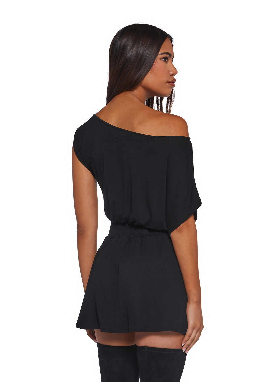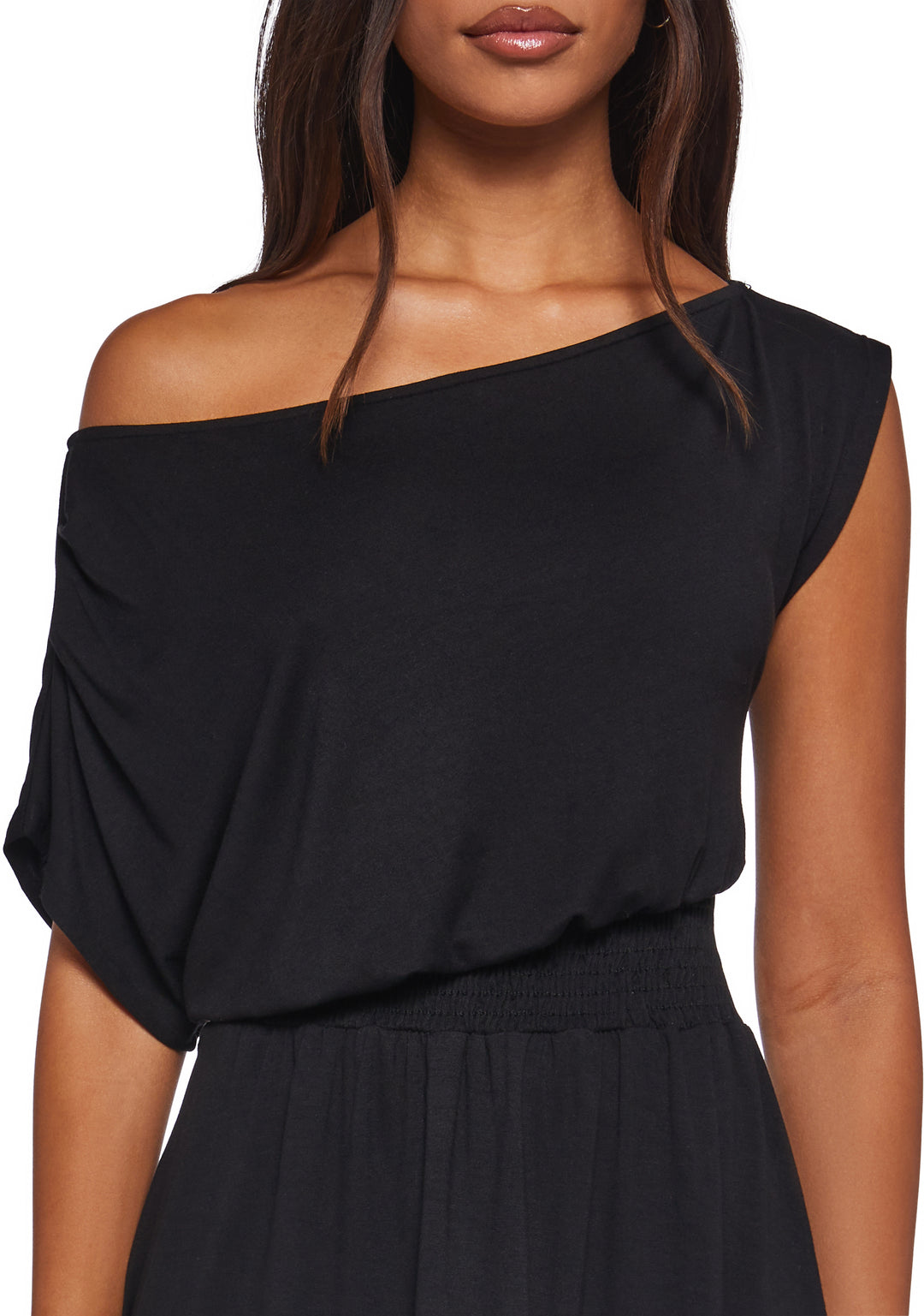 This mini dress has a stretchy jersey knit construction , a shirred waist, an off the shoulder design, and a flowy skirt.