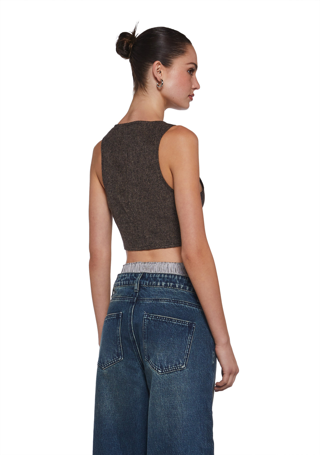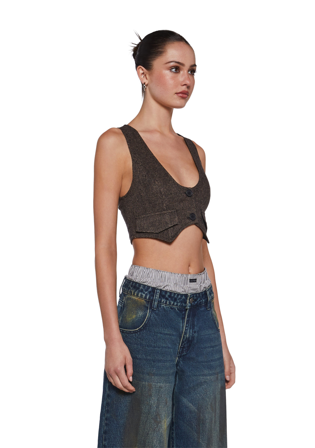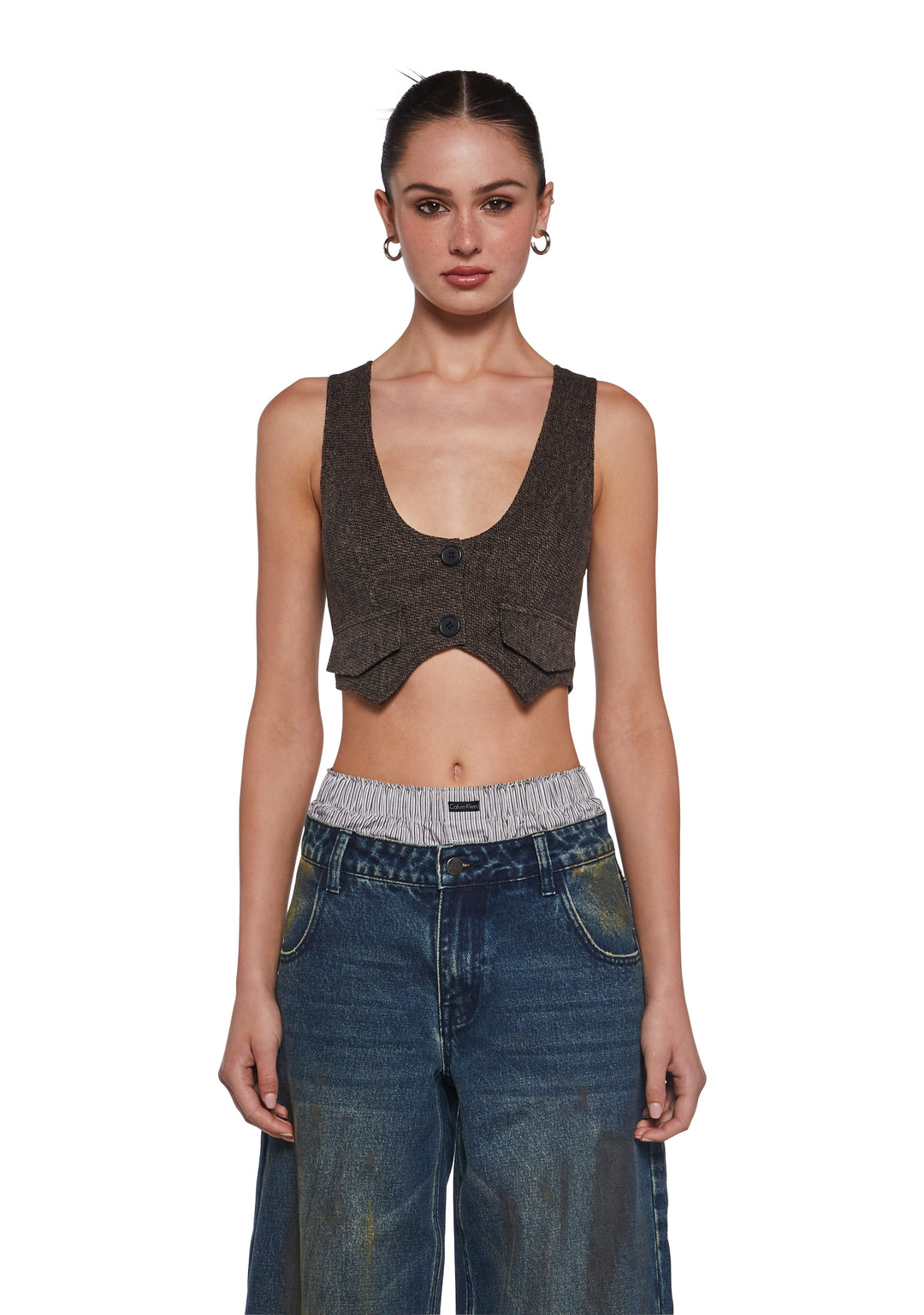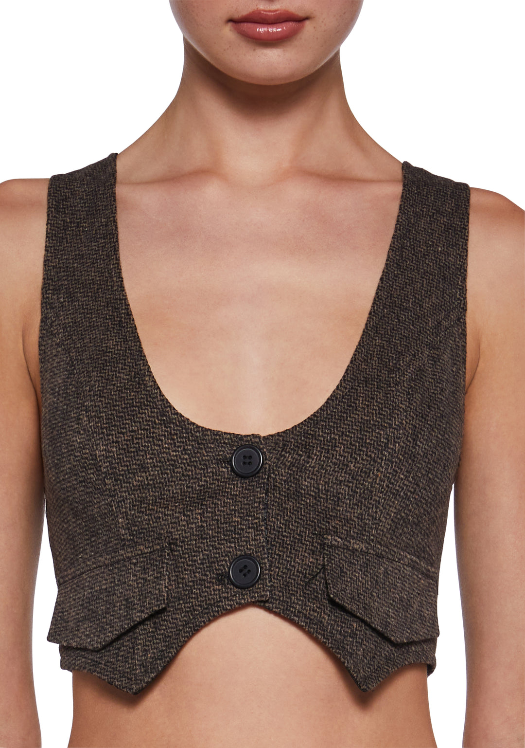 This cropped vest has a tweed construction, decorative pockets on the front, a pointed hem, and front button closures.