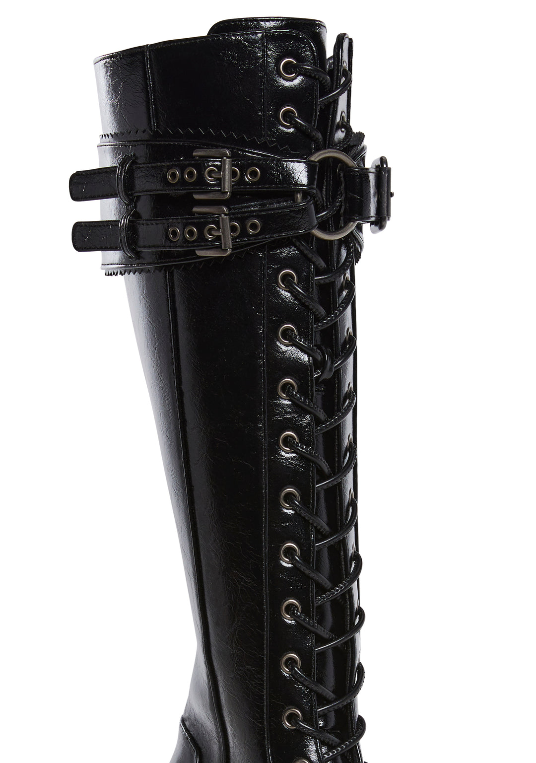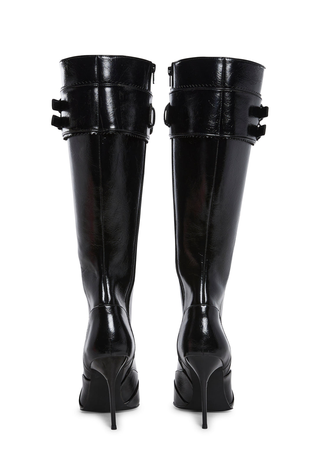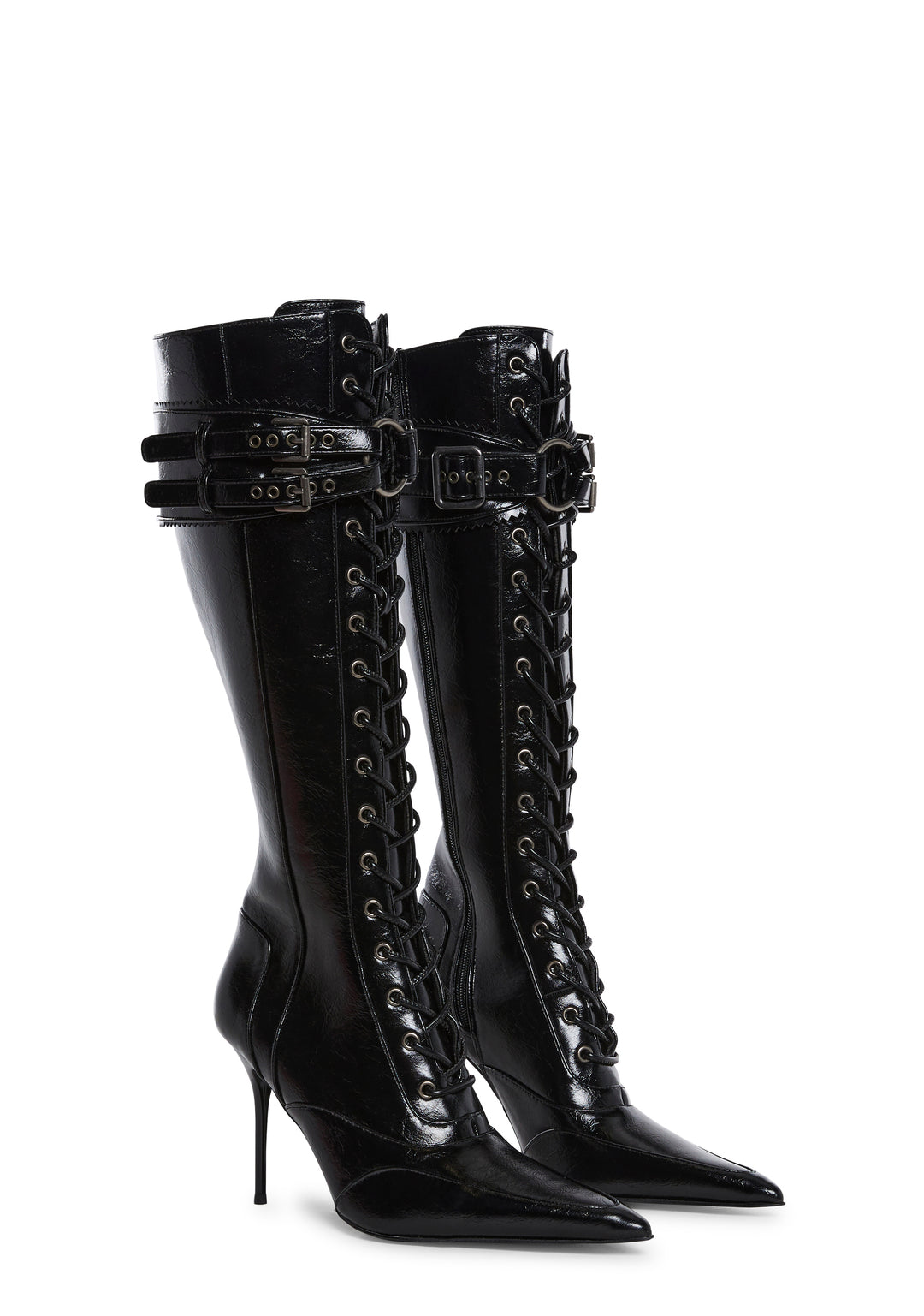 These boots have a vegan leather construction, a pointed toe design, stiletto heels, front lace-ups, adjustable buckles with O-ring hardware, and side zipper closures.