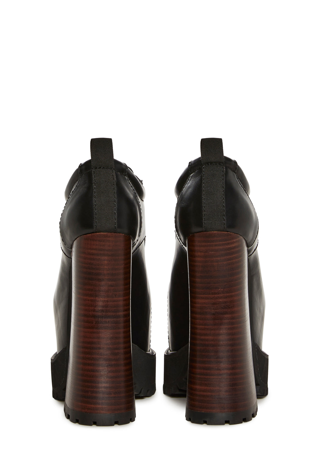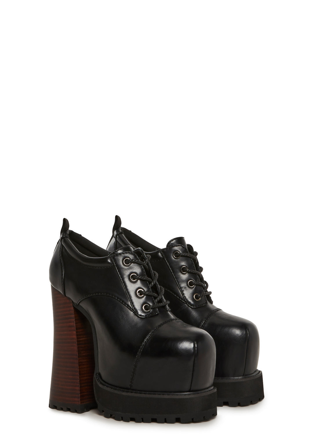These platform oxfords have a vegan leather construcion, treaded platform soles, contrast colored block heels, and front lace-up closures.