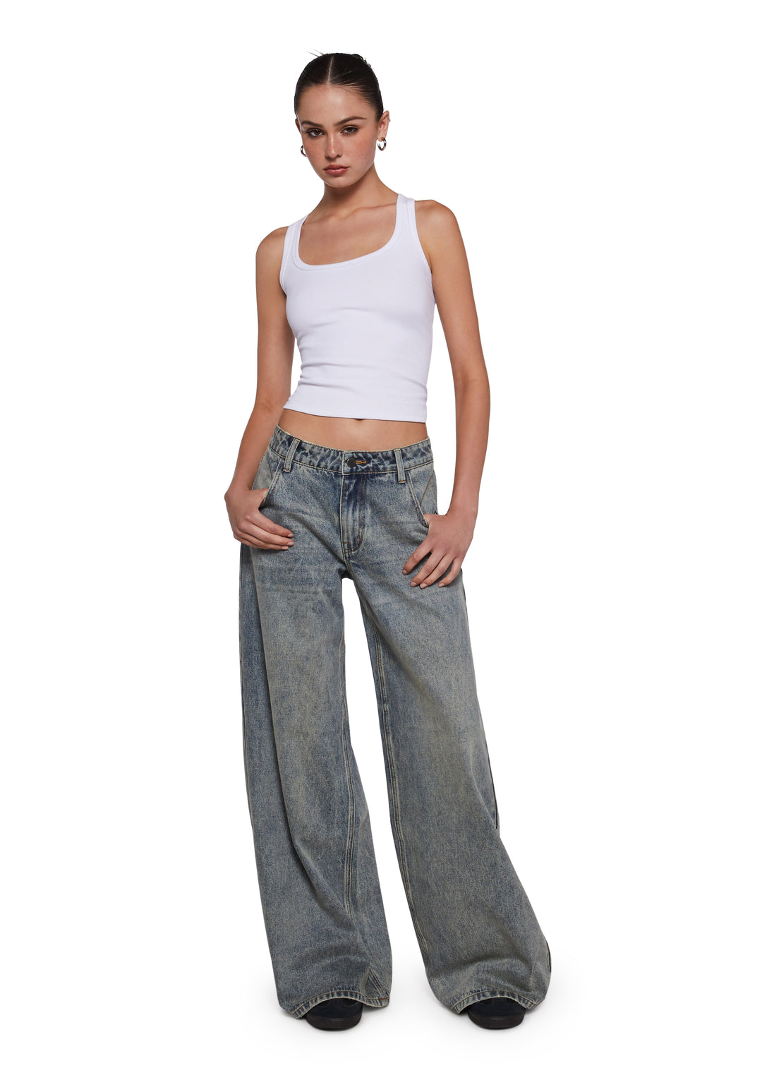 These jeans have a denim construction, a washed finish, a wide leg silhouette, front and back pockets, and a front button and zipper closure.