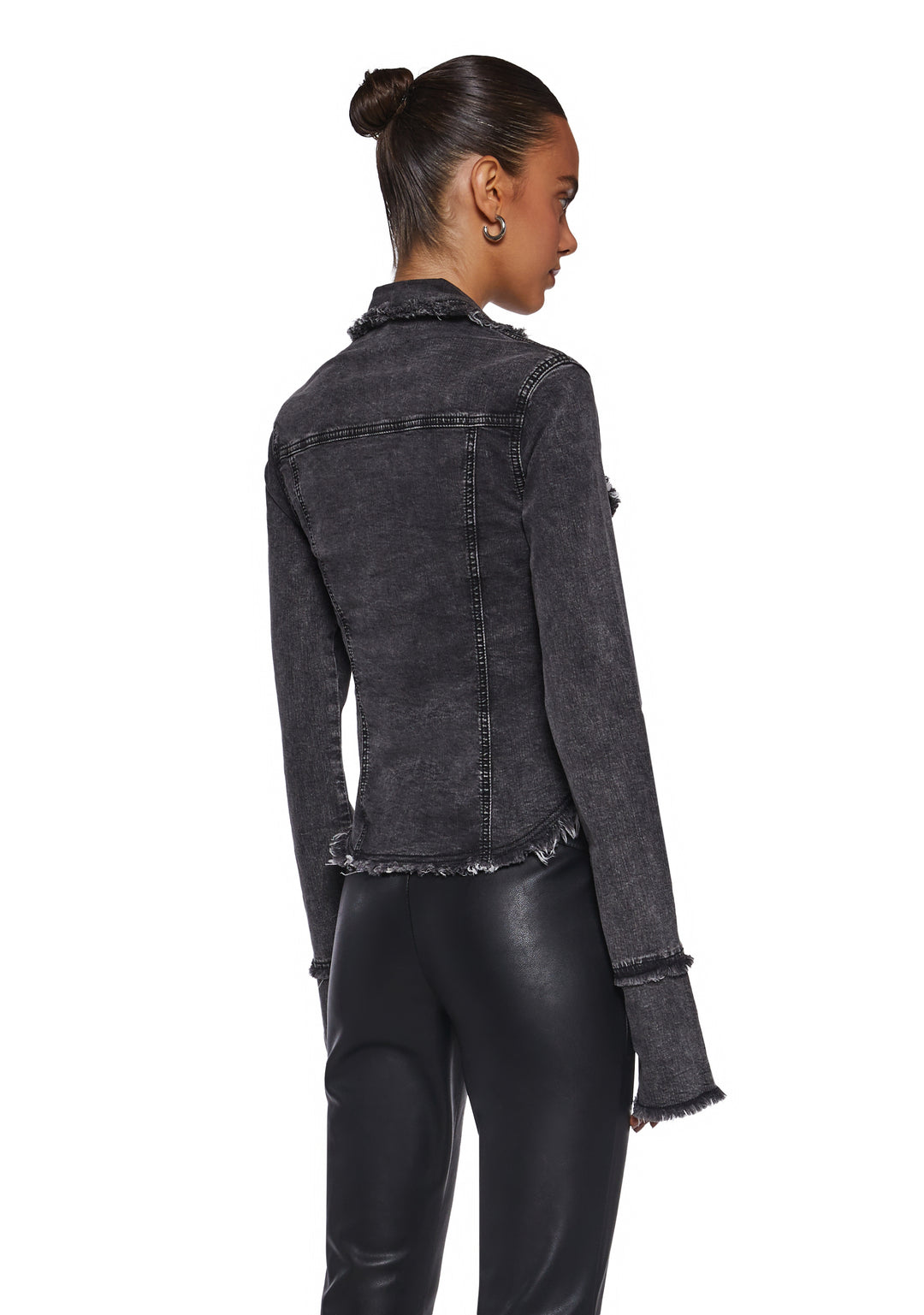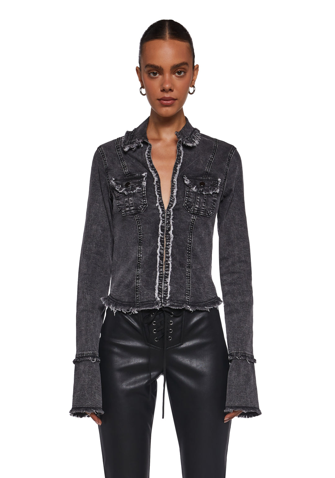 Smooch them at the top wearing this long sleeve top that has a washed denim construction, a distressed and frayed design, a collared neckline, chest pockets with snap button closures, and front hook and eye closures.