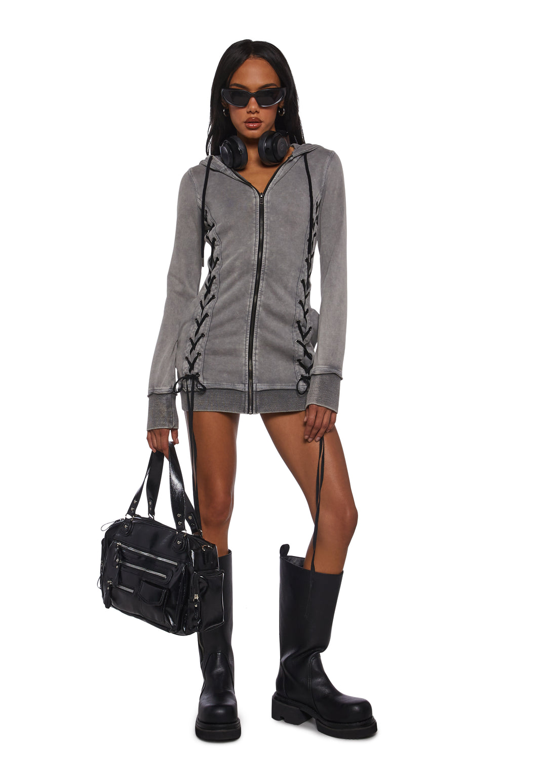 This mini dress has a washed cotton construction, a ribbed trim, contrast colored lace up details on the front, long sleeves, an attached hoodie with adjustable drawstring closures, and a front zipper closure.