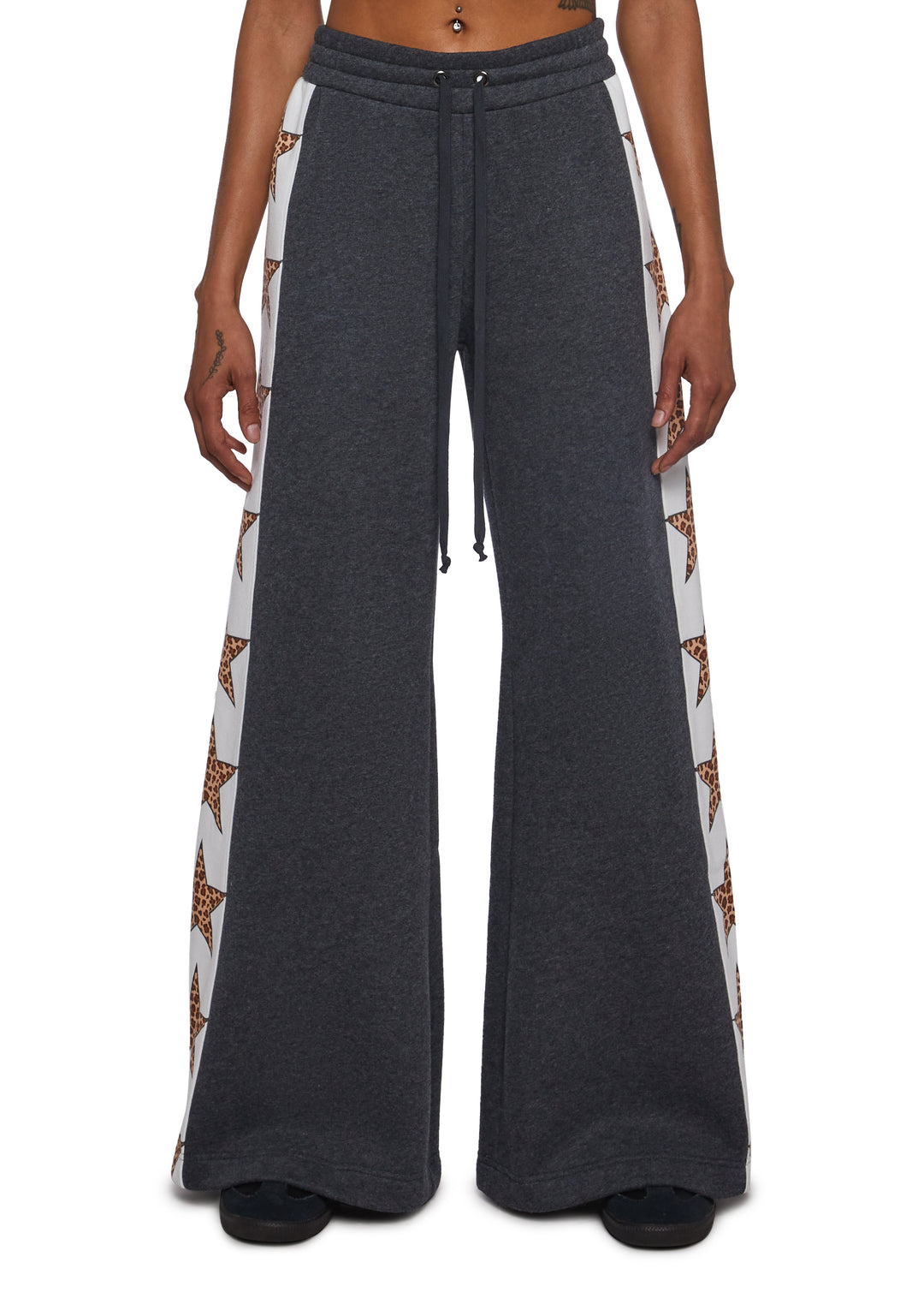 These sweatpants have a washed cotton construction, a fleece lining, a wide leg design, star graphics on the sides, and an elastic waistband with adjustable drawstring closures.