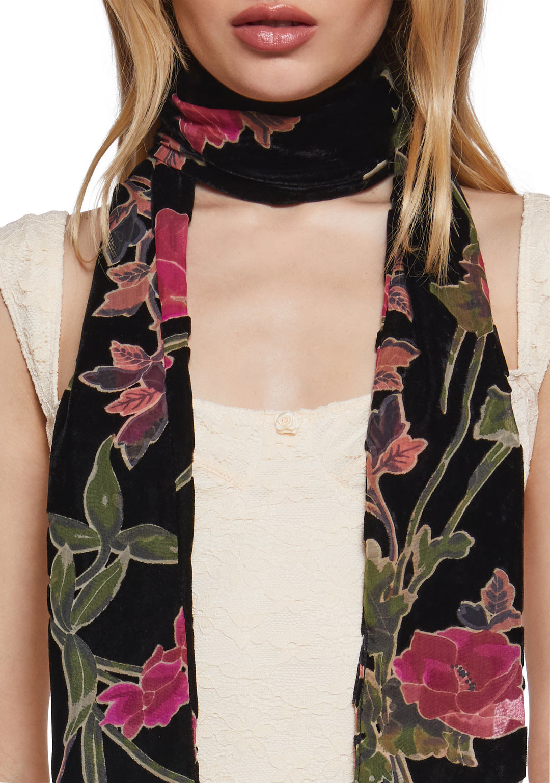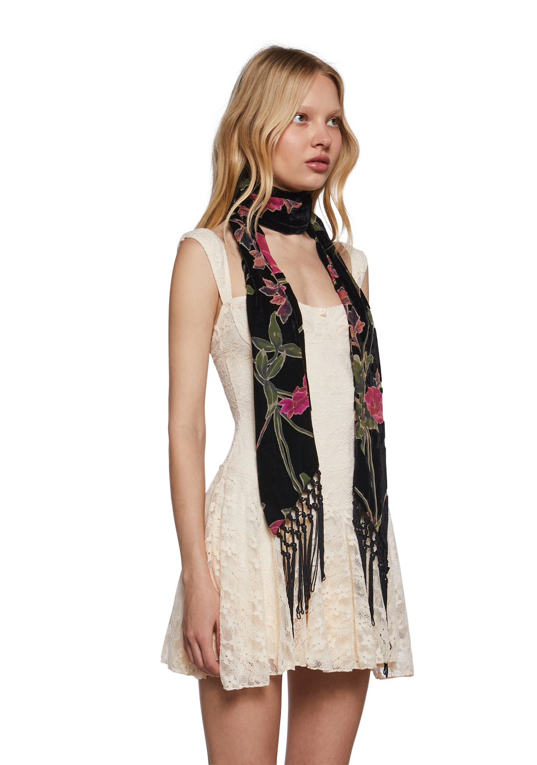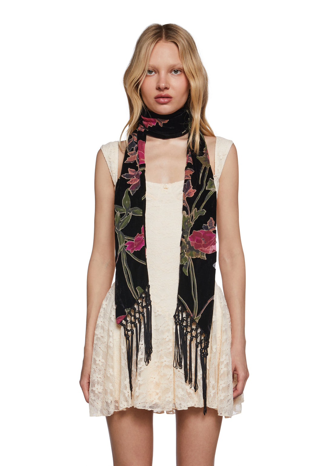 This scarf has a velvet construction, a floral burnout design, and fringed tassels on the ends.