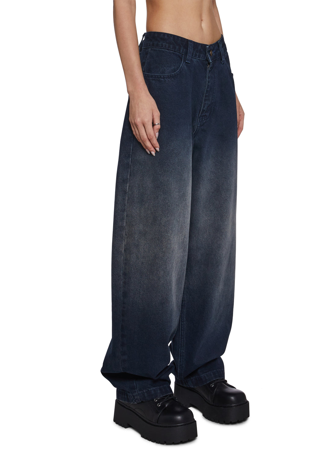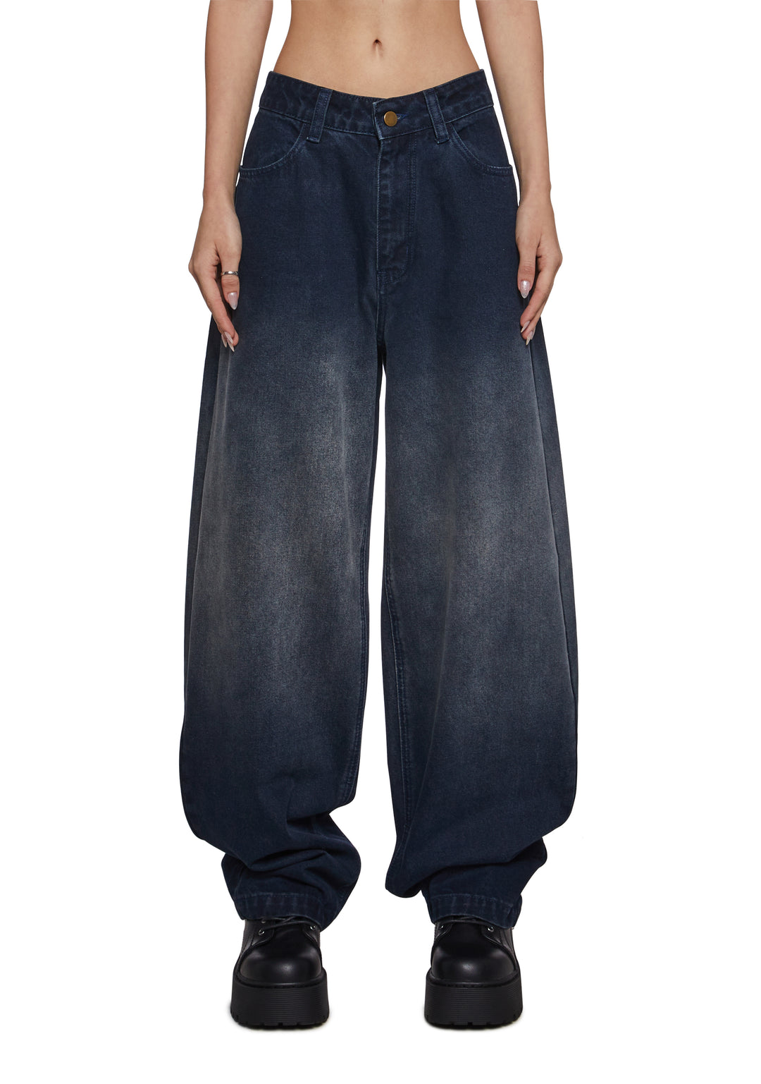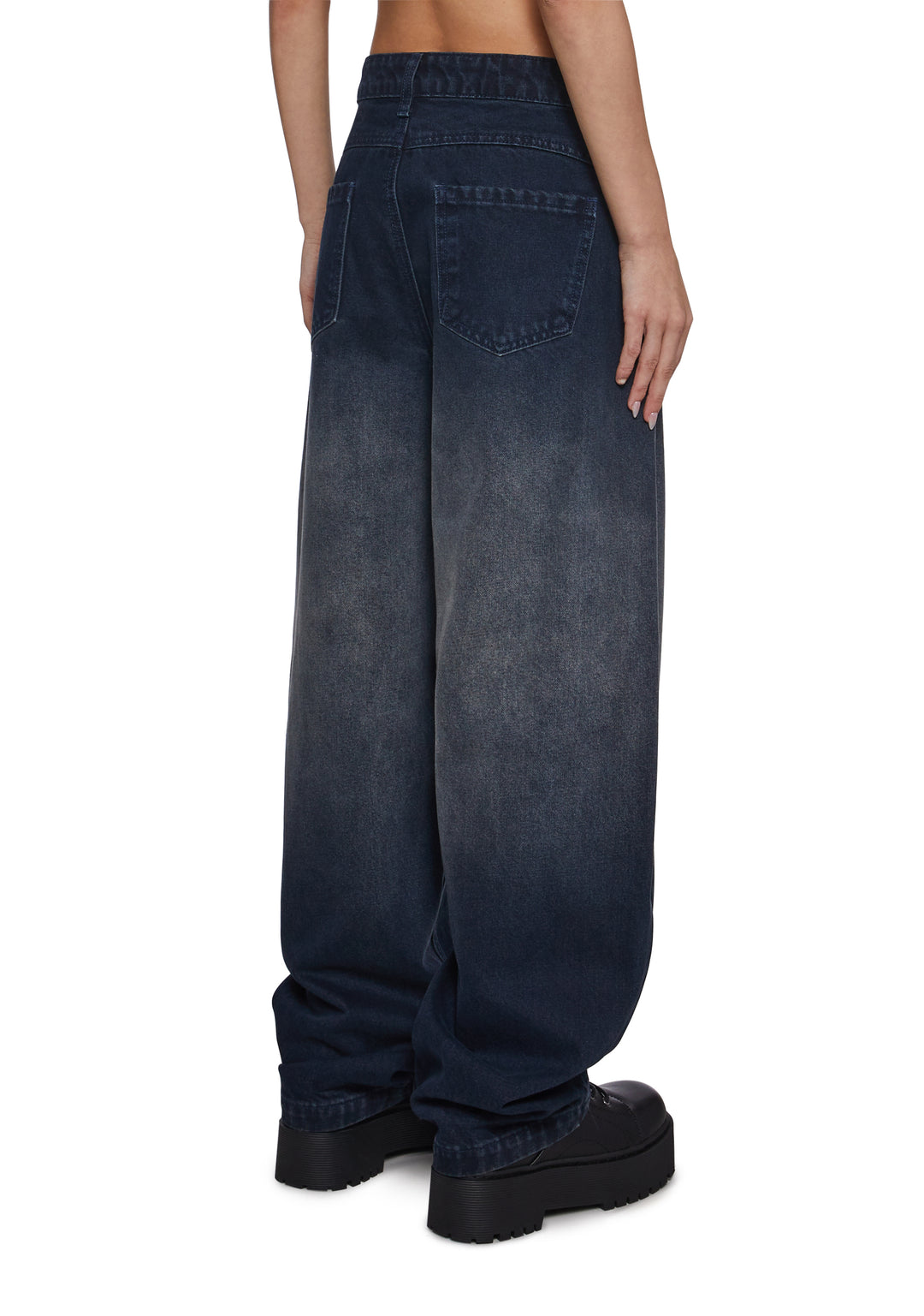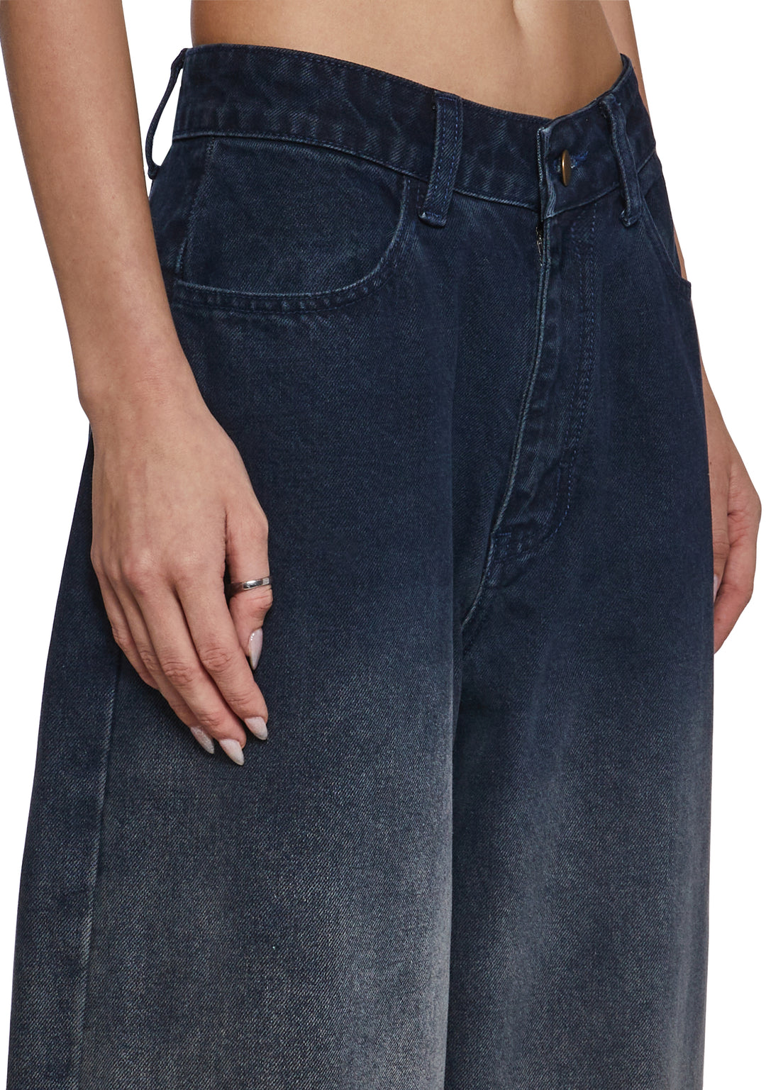 These dark-wash wide-leg jeans bring a relaxed, modern silhouette with a softly structured drape. Designed to sit comfortably at the waist, they feature a clean front with subtle fading for a lived-in feel while maintaining a polished finish. The oversized leg creates effortless movement and a fashion-forward edge.