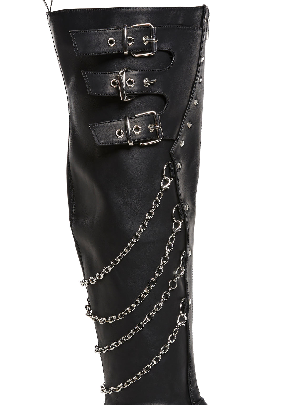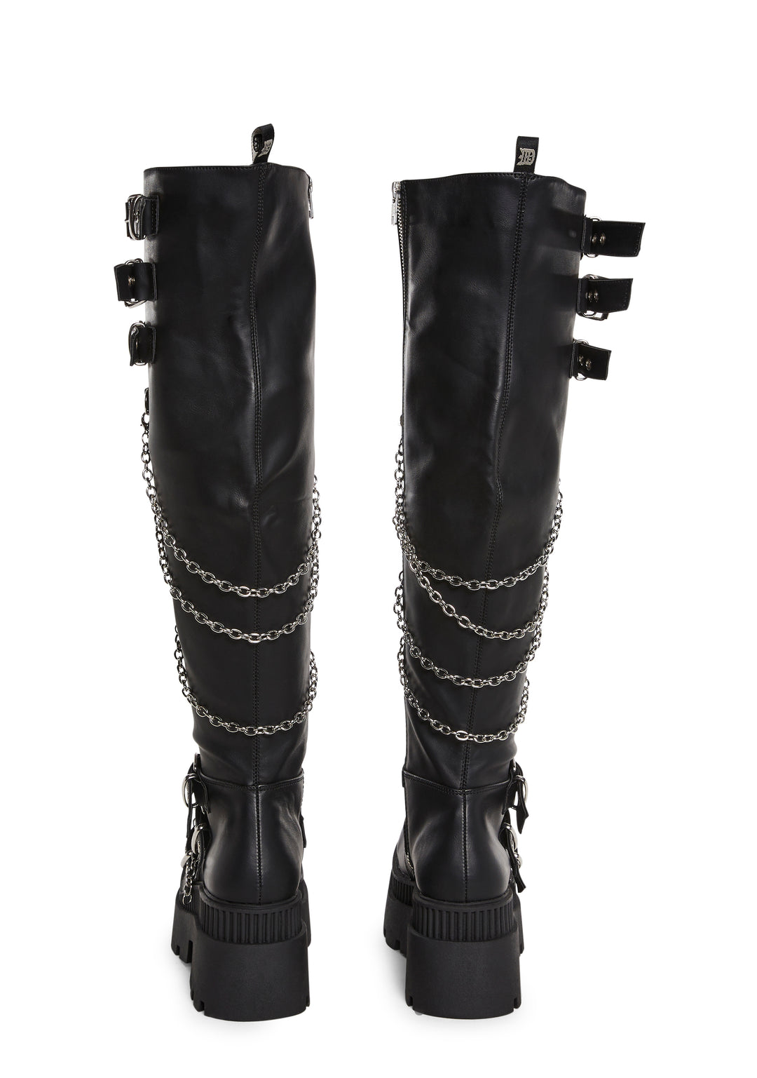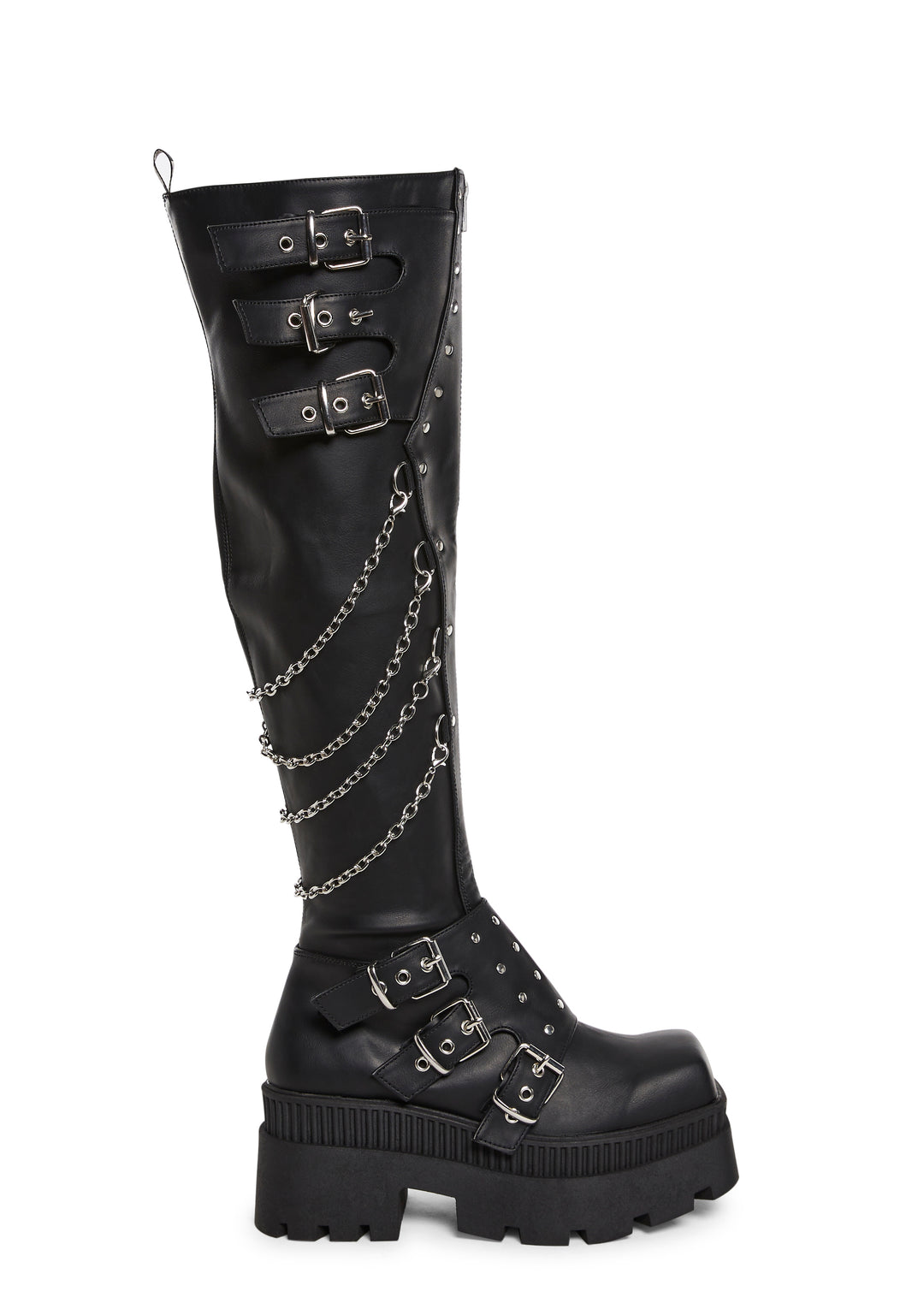 These knee-high boots have a vegan leather construction with an ornamental shield adorned with studs, buckle strap detailing, D-ring hardware, removable hanging chains on the back, a square-toe platform design, and side zipper closures.