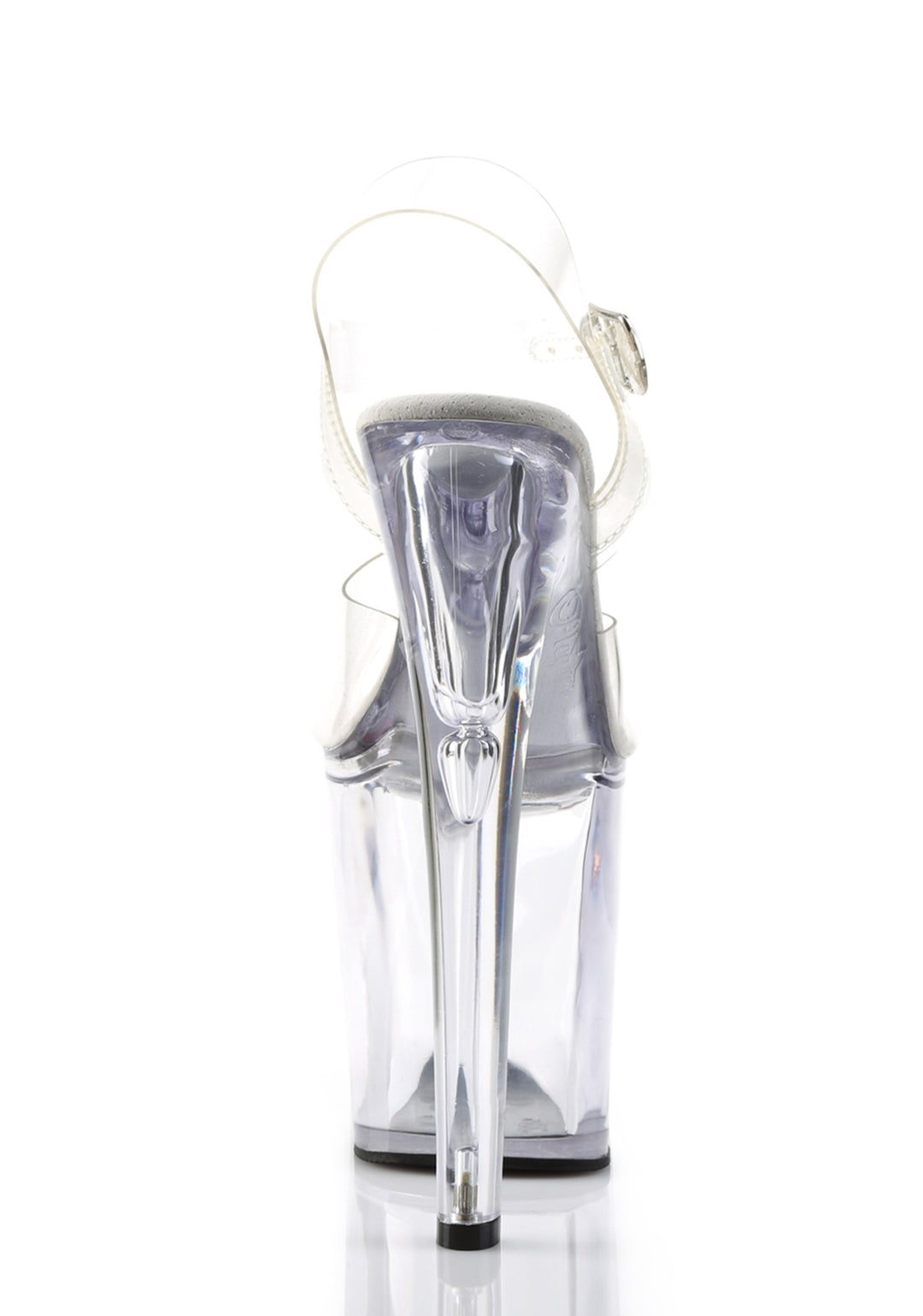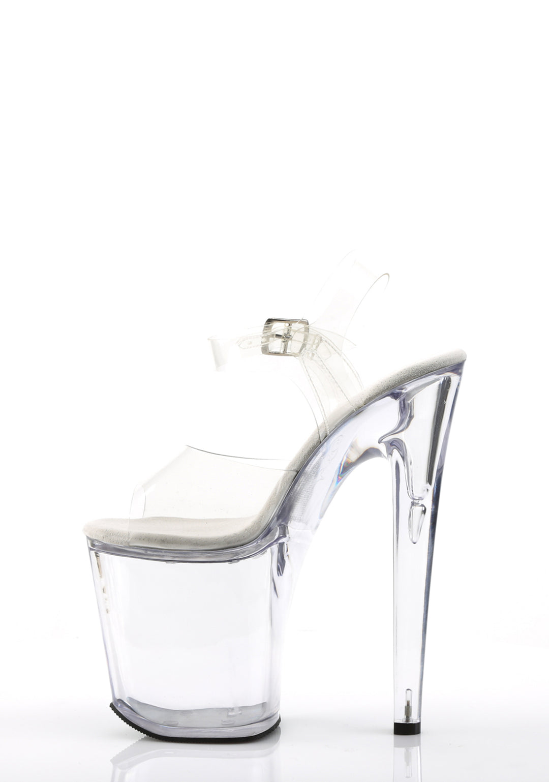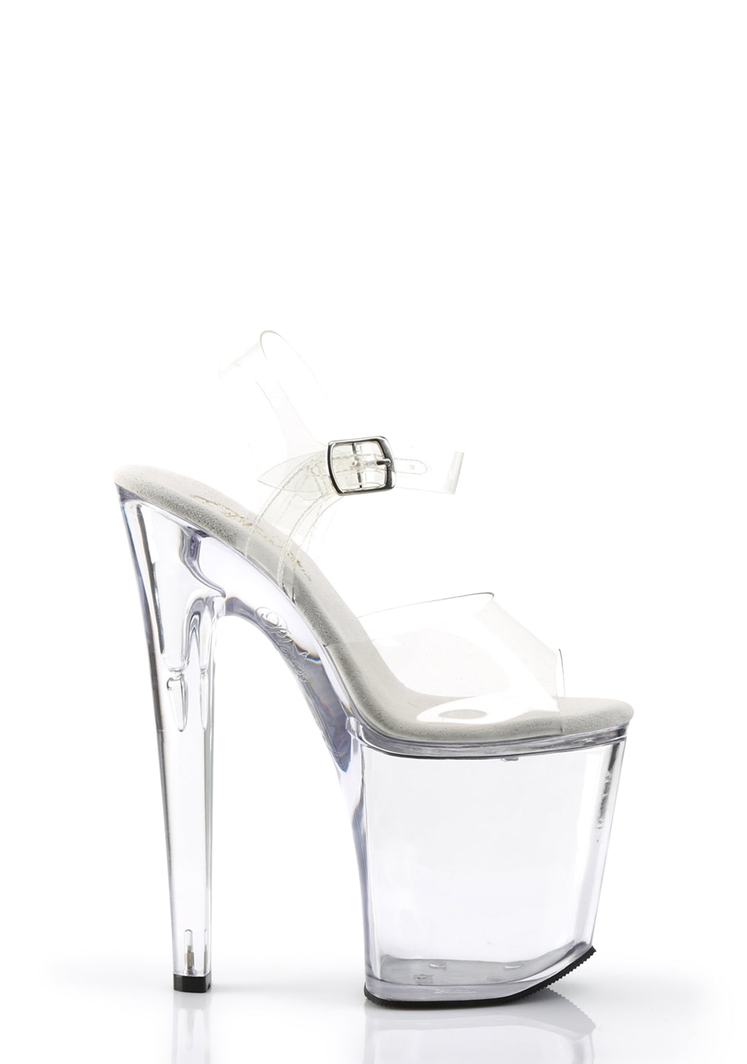 These shoes have clear vinyl uppers, clear platform soles and stiletto heels, and adjustable buckle closures.