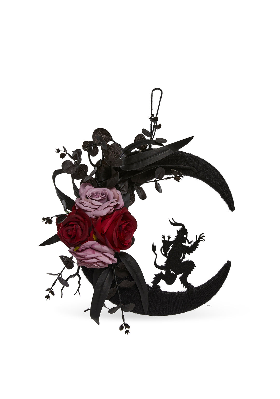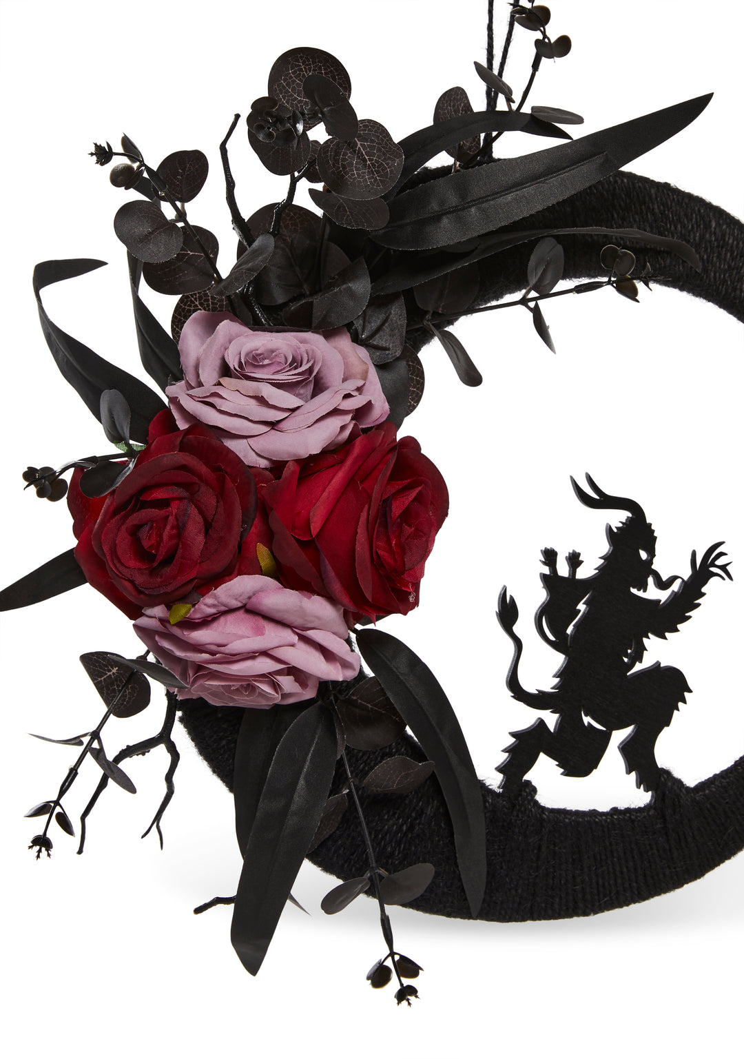 This wreath has a half-moon shape with a yarn construction, adorned with faux roses and flowers, a cutout silhouette of Krampus, and a top yarn loop to make hanging easy.